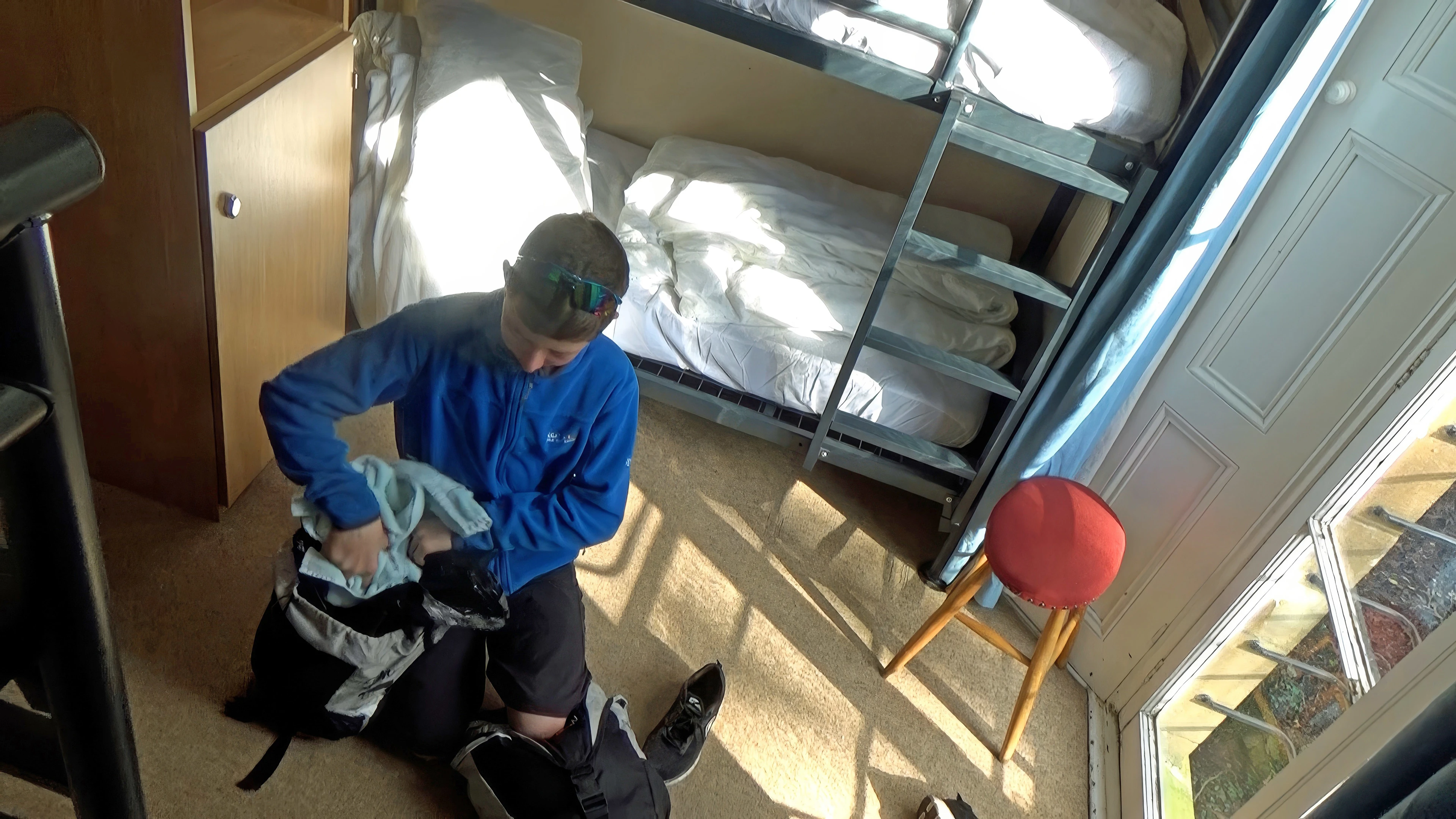 George packs at Bath Youth Hostel, oblivious to his coat behind the curtain