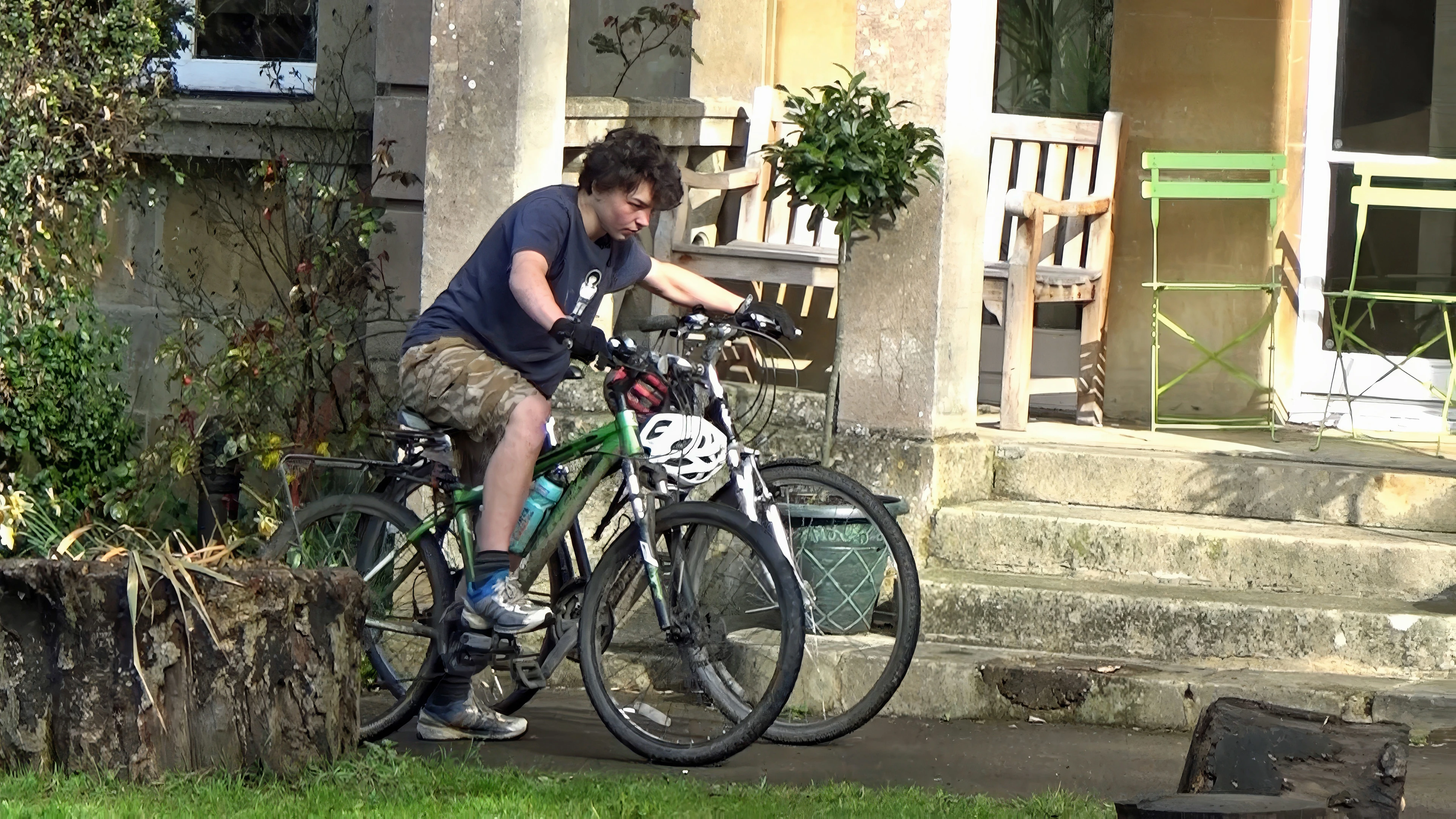 Lawrence shuttles two bikes from the shed to Bath Youth Hostel’s front