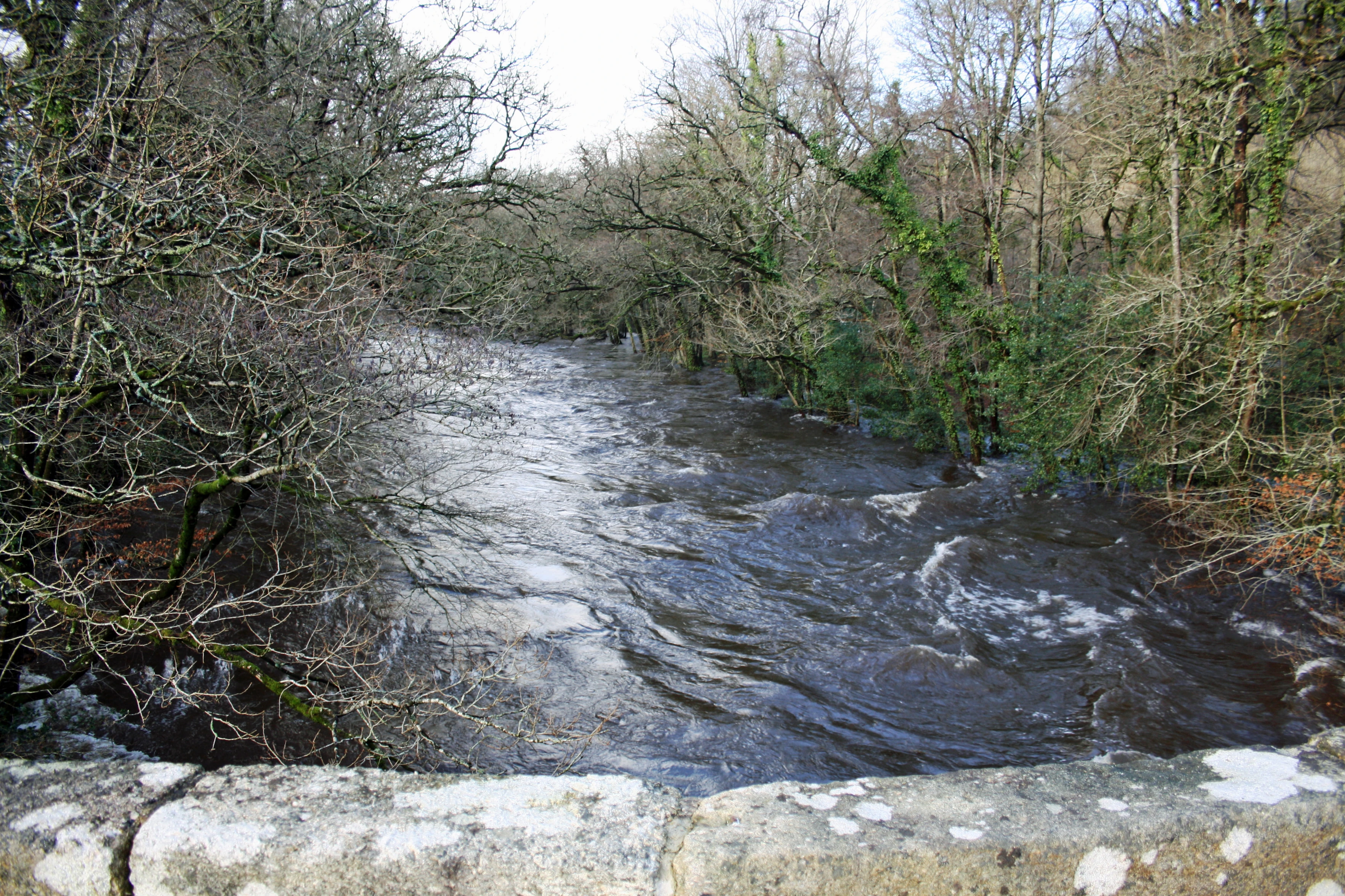 River Dart in full flood, looking upstream from Austin's Bridge, Buckfastleigh.