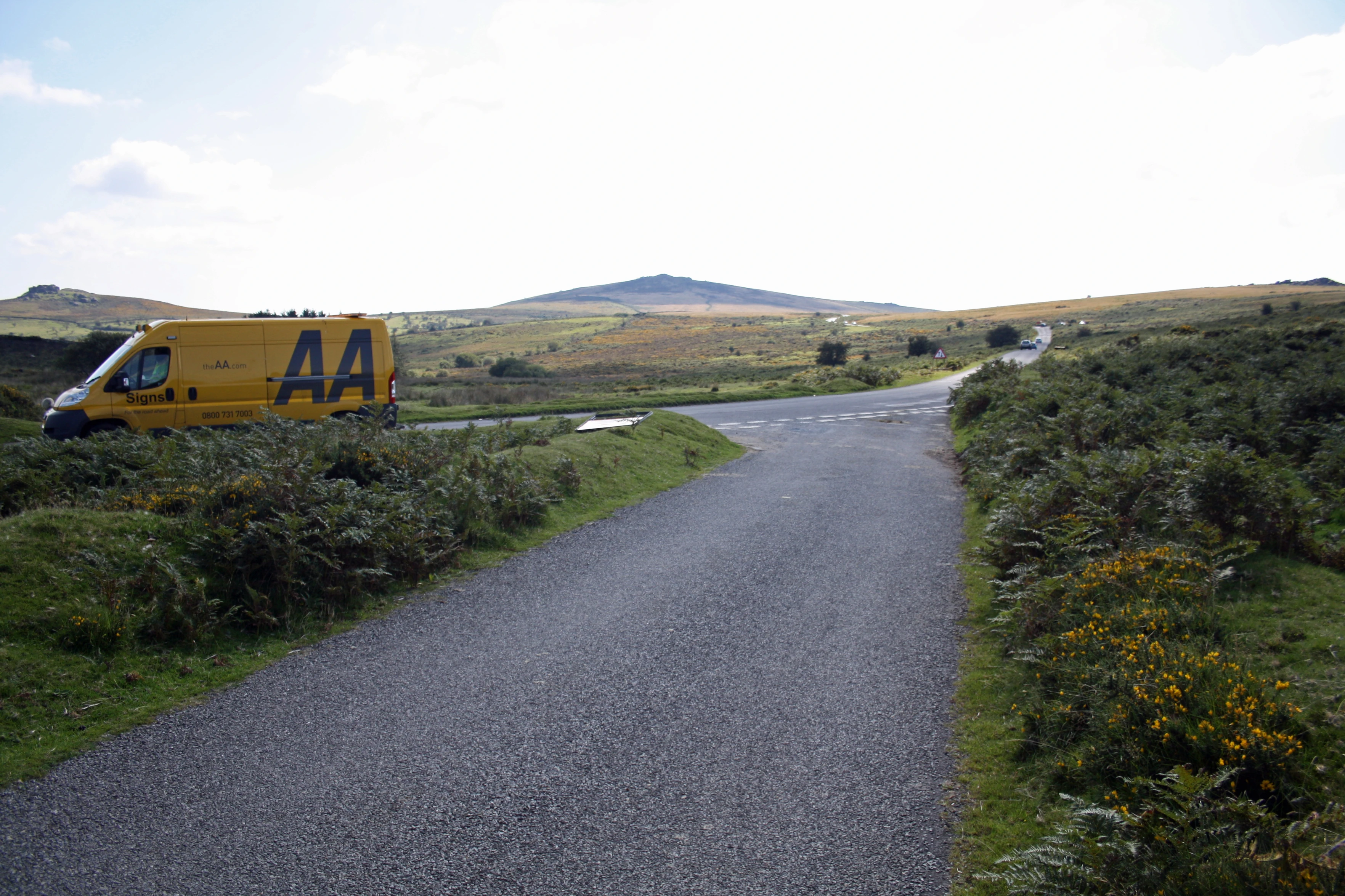 One of many AA vans putting up Widecombe Fair signs near the Bonehill turn-off.