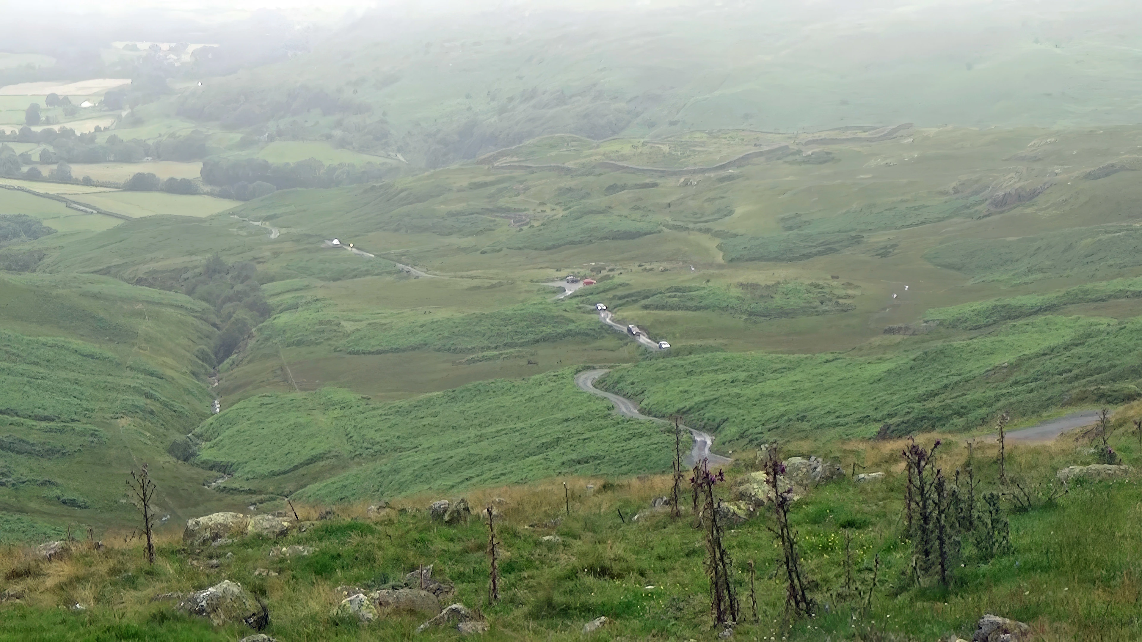 The road drops into Eskdale from Hardknott Pass