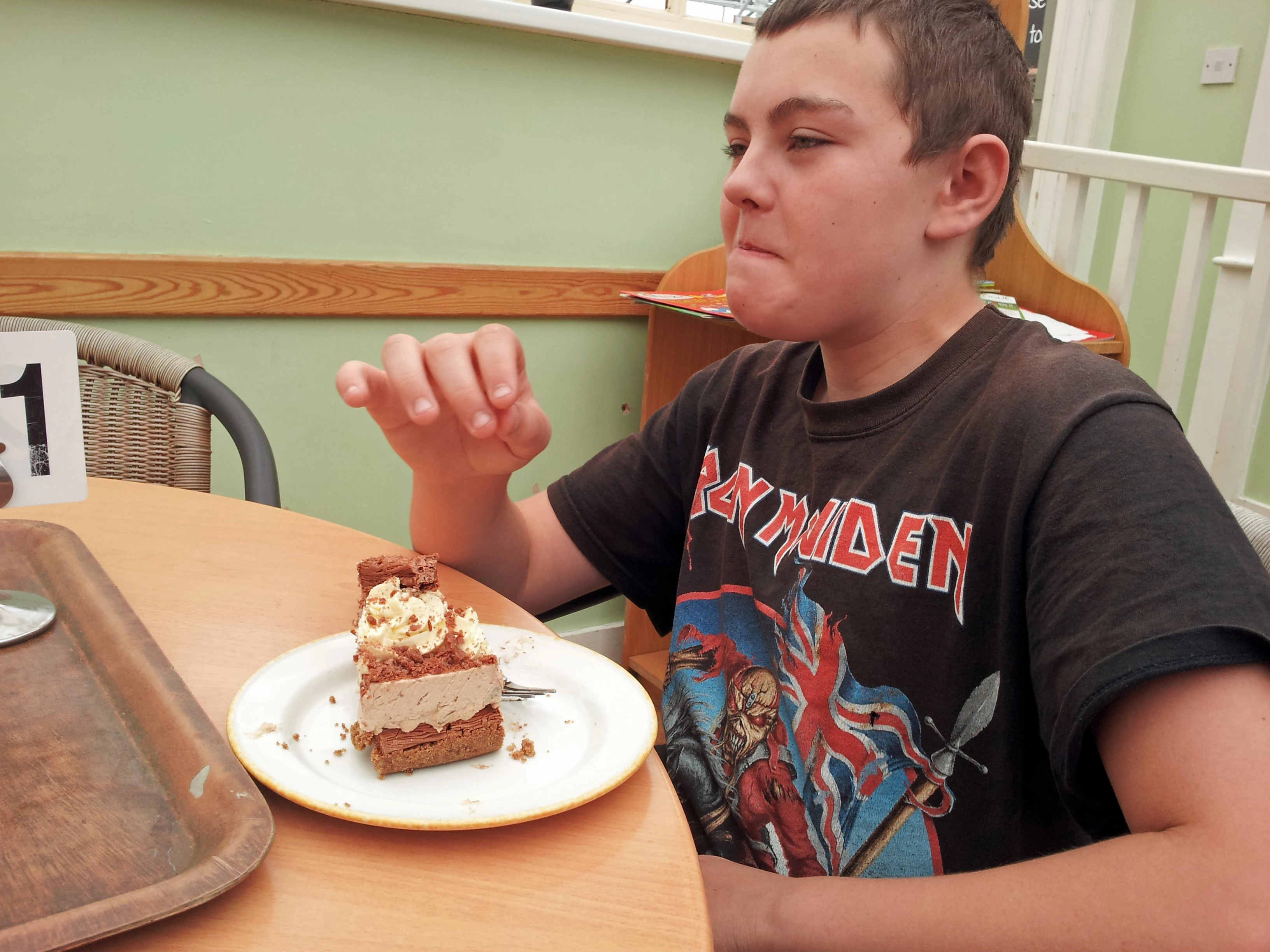 Dillan savours his chocolate flake cheesecake at Fermoy's Garden Centre. New photo for 2024.
