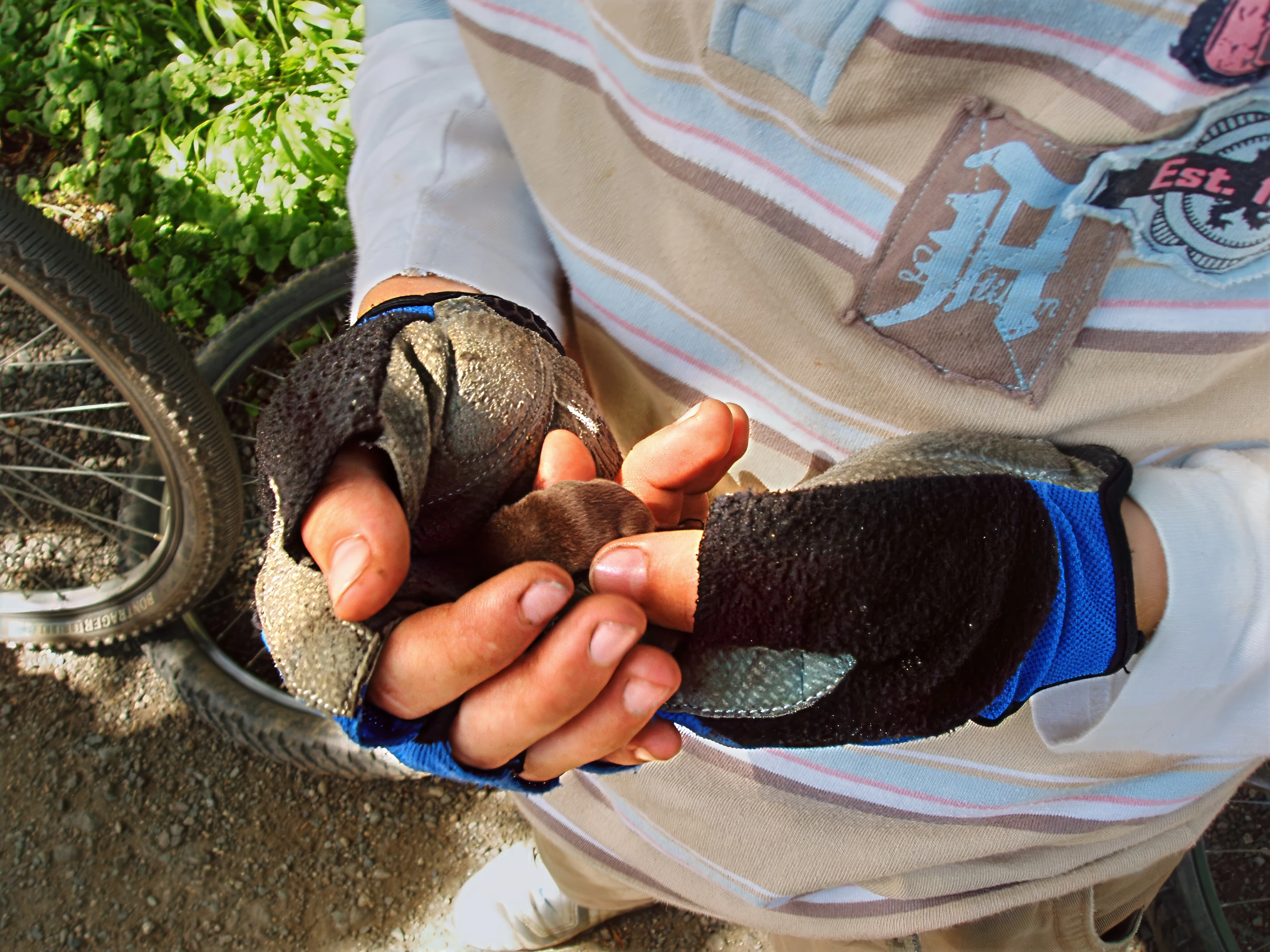 The lads find a shrew on the Camel Trail, heading back to Bodmin.