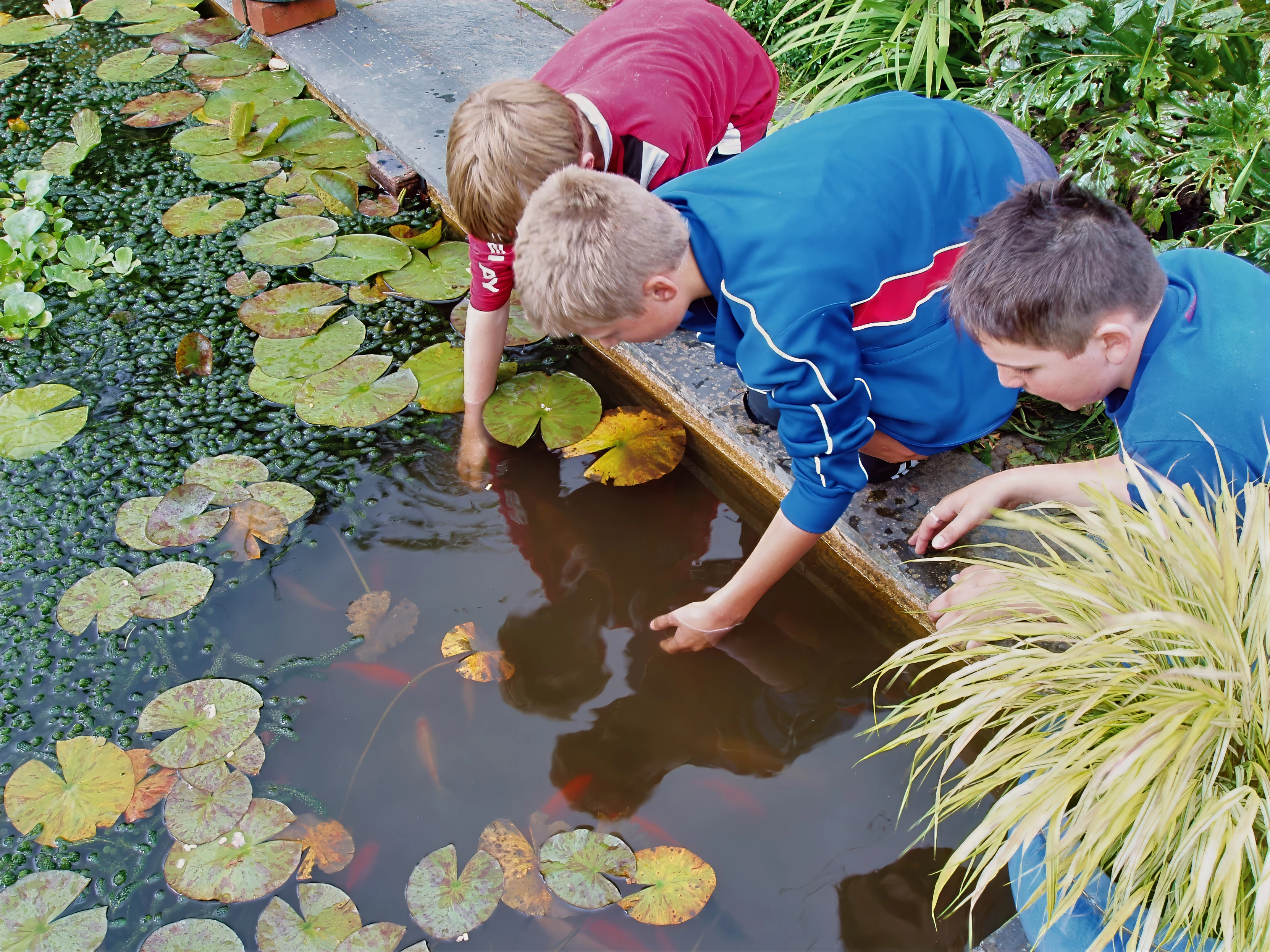 Olly, Sam and Zac try, unsuccessfully, to fish the Hill House Nursery pond.