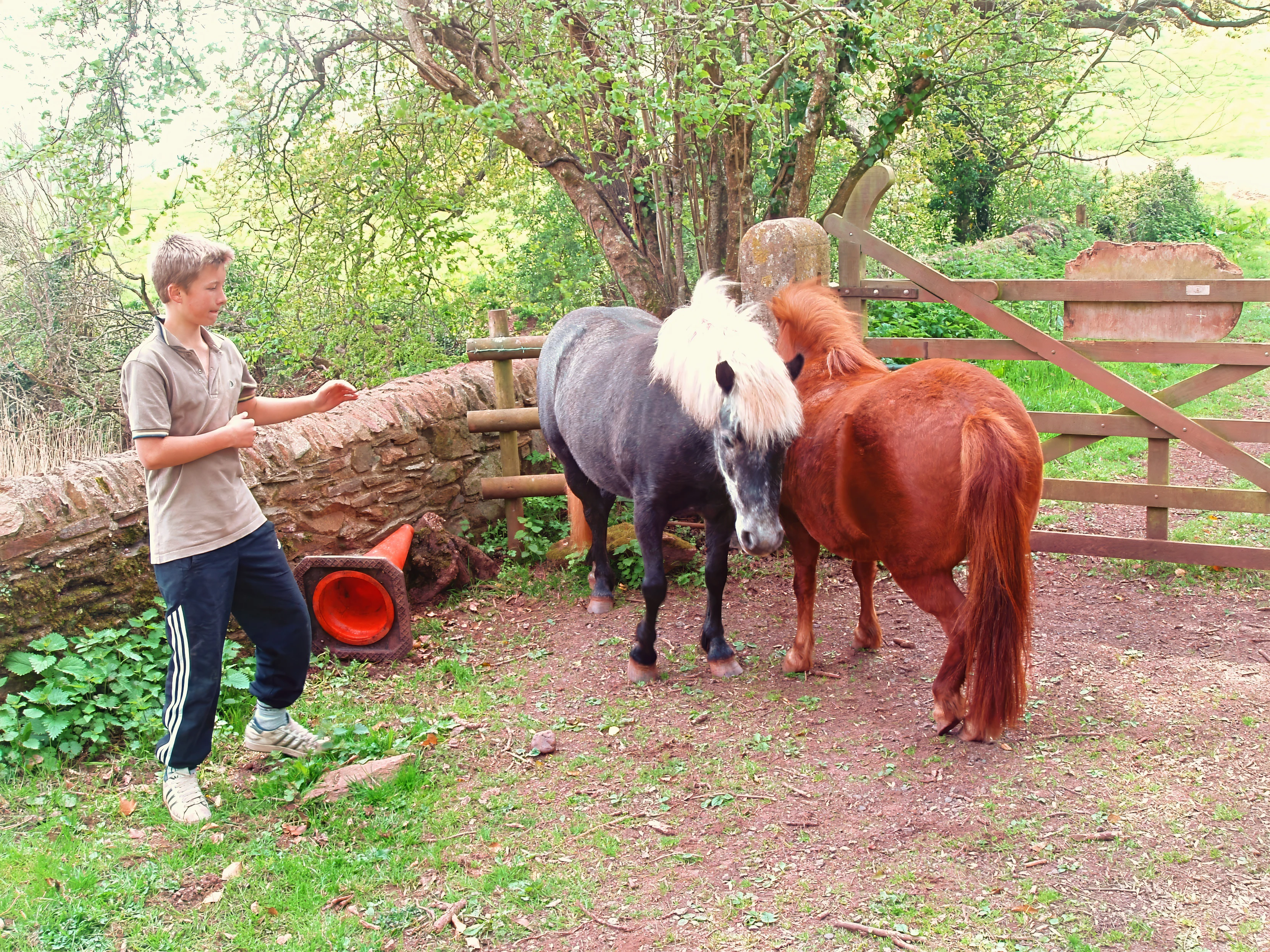 Jordan cautiously approaches two delightful horses at the bottom of the path