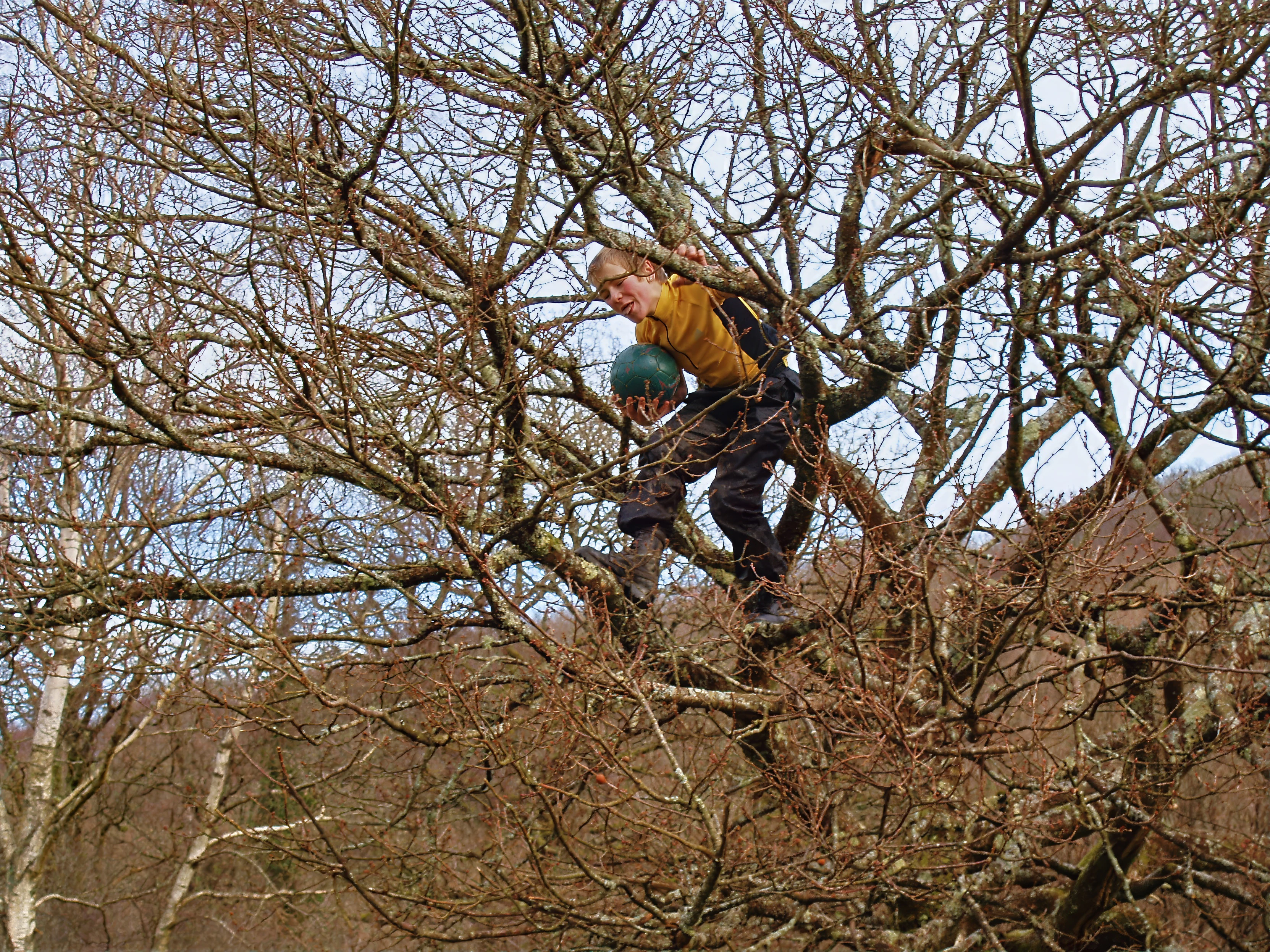 Josh retrieves the Aerobie from the tree, courtesy of a football.