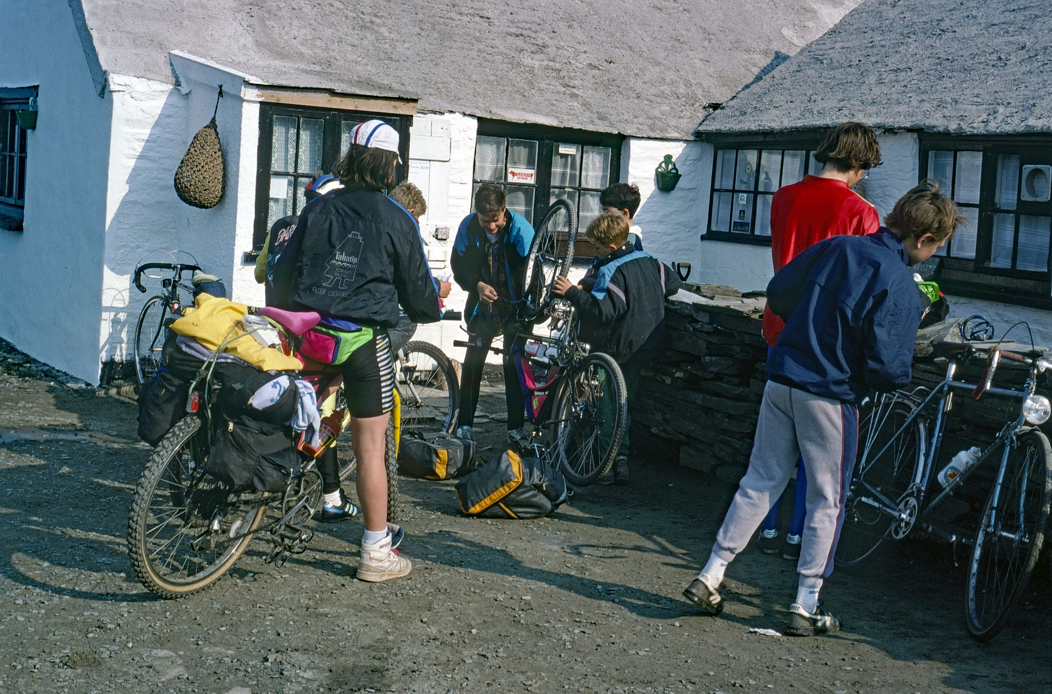 Paul Smith’s lightning brake cable swap outside Tintagel Youth Hostel—time we were off.