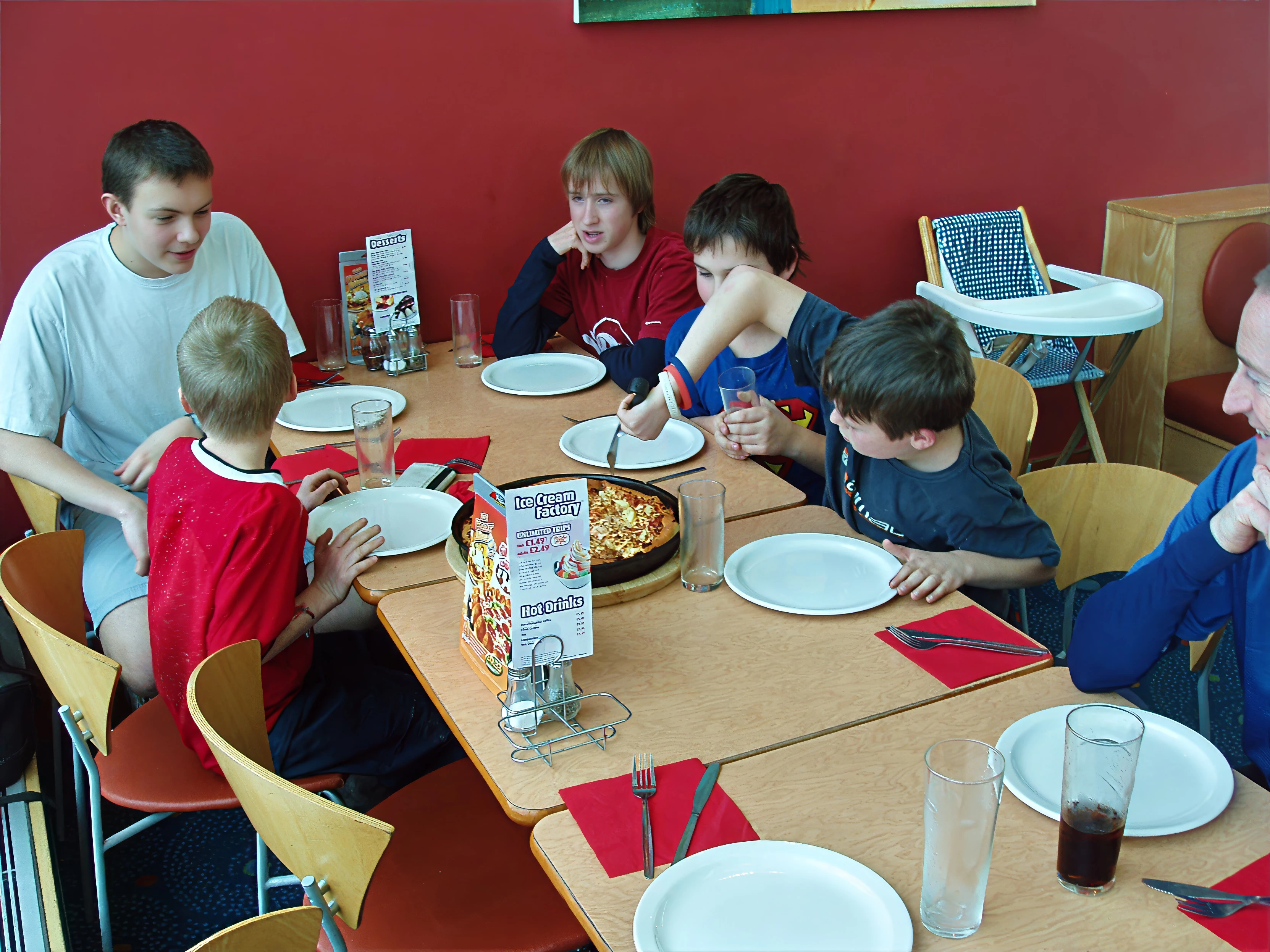 The first enormous pizza arrives.