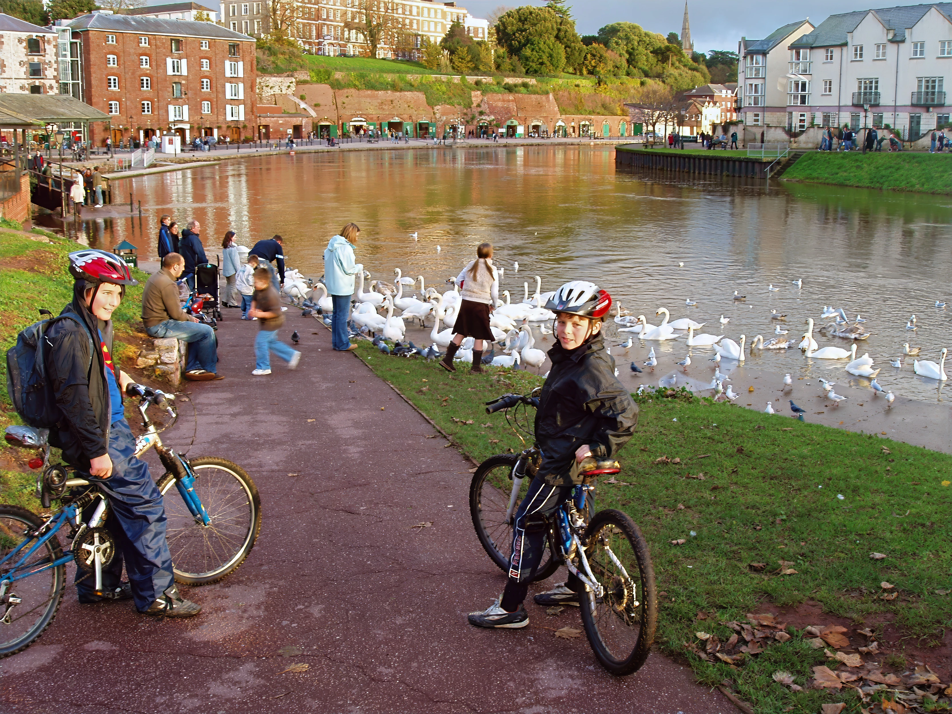 Zac and Alex with swans and pigeons at Exeter Quay.