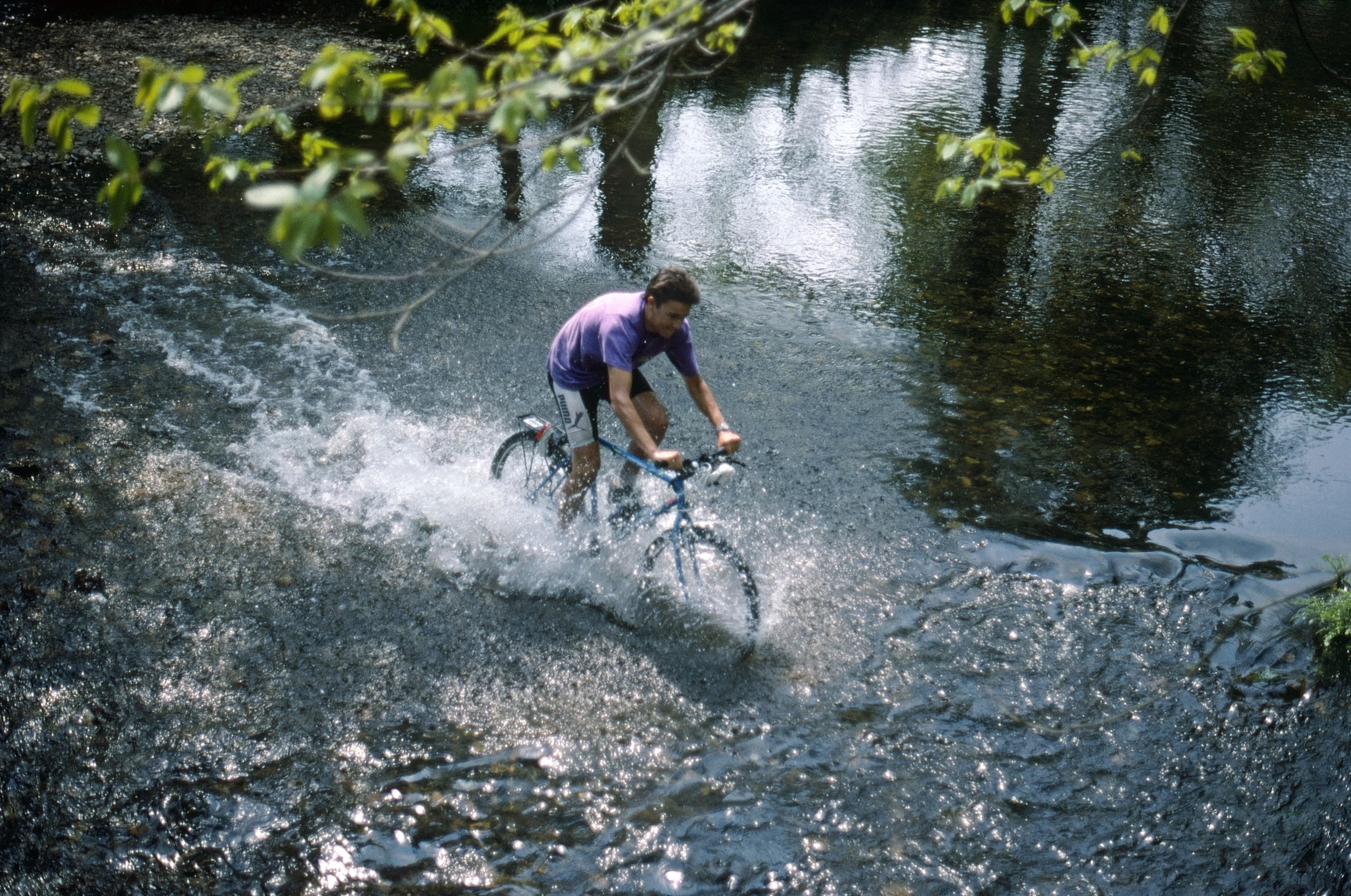 Martin obligingly waterlogs his wheel bearings in the River Lynher near Pillaton.