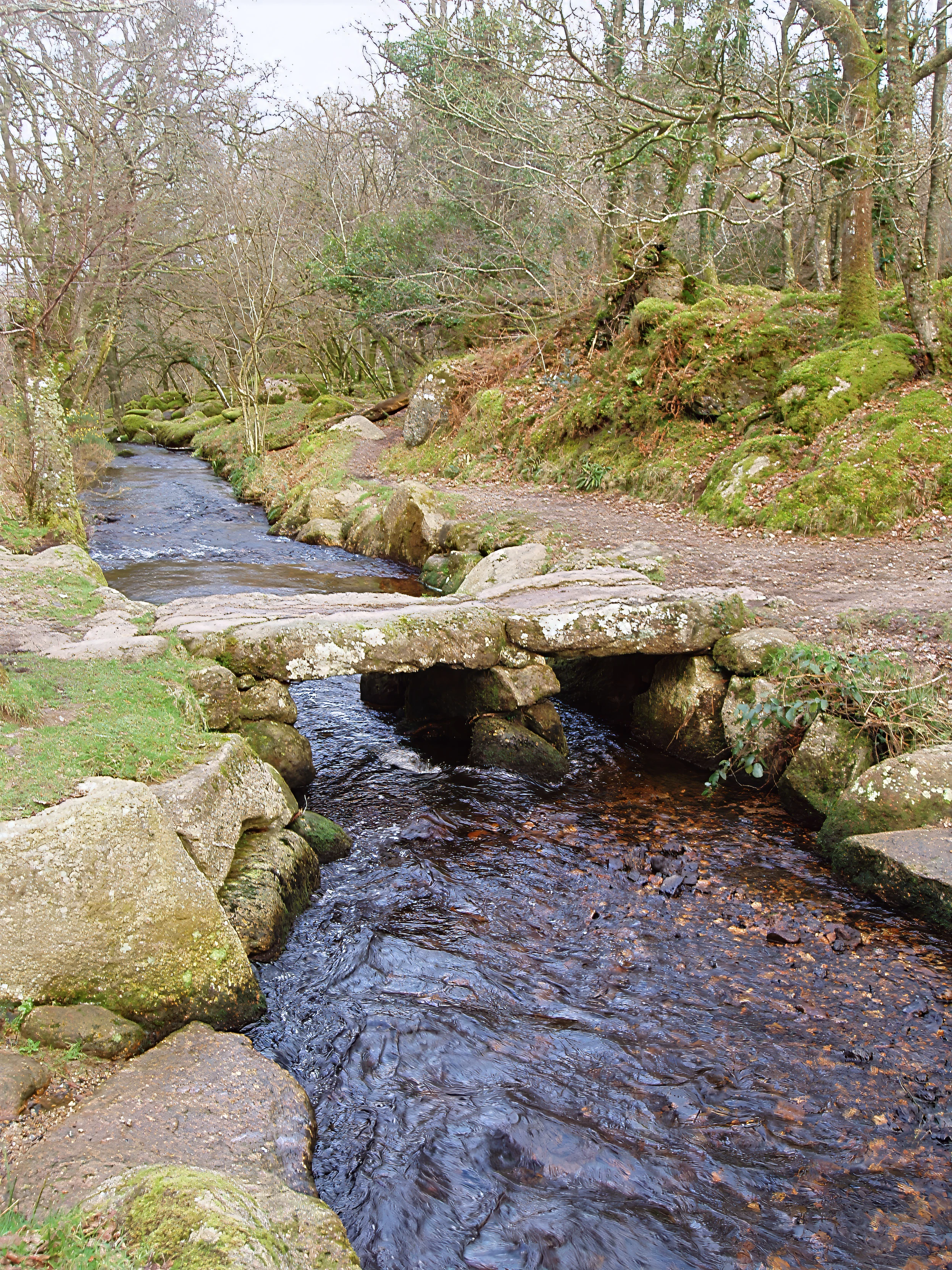 Stone clapper bridge over Becka Brook at the valley bottom.