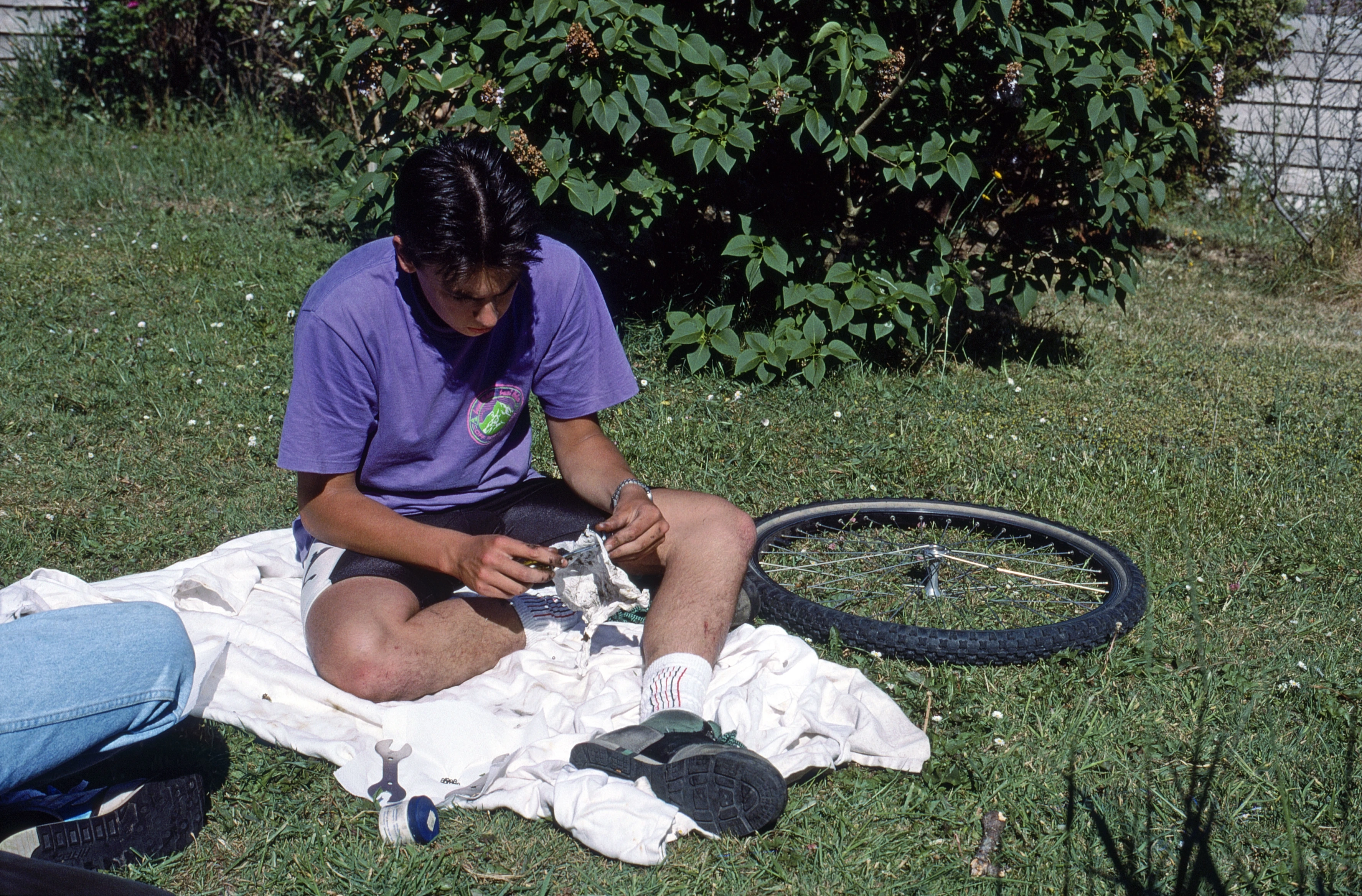 Yesterday at Crofters: Martin Hills regreasing his hubs for today’s ride, Neil looking on.