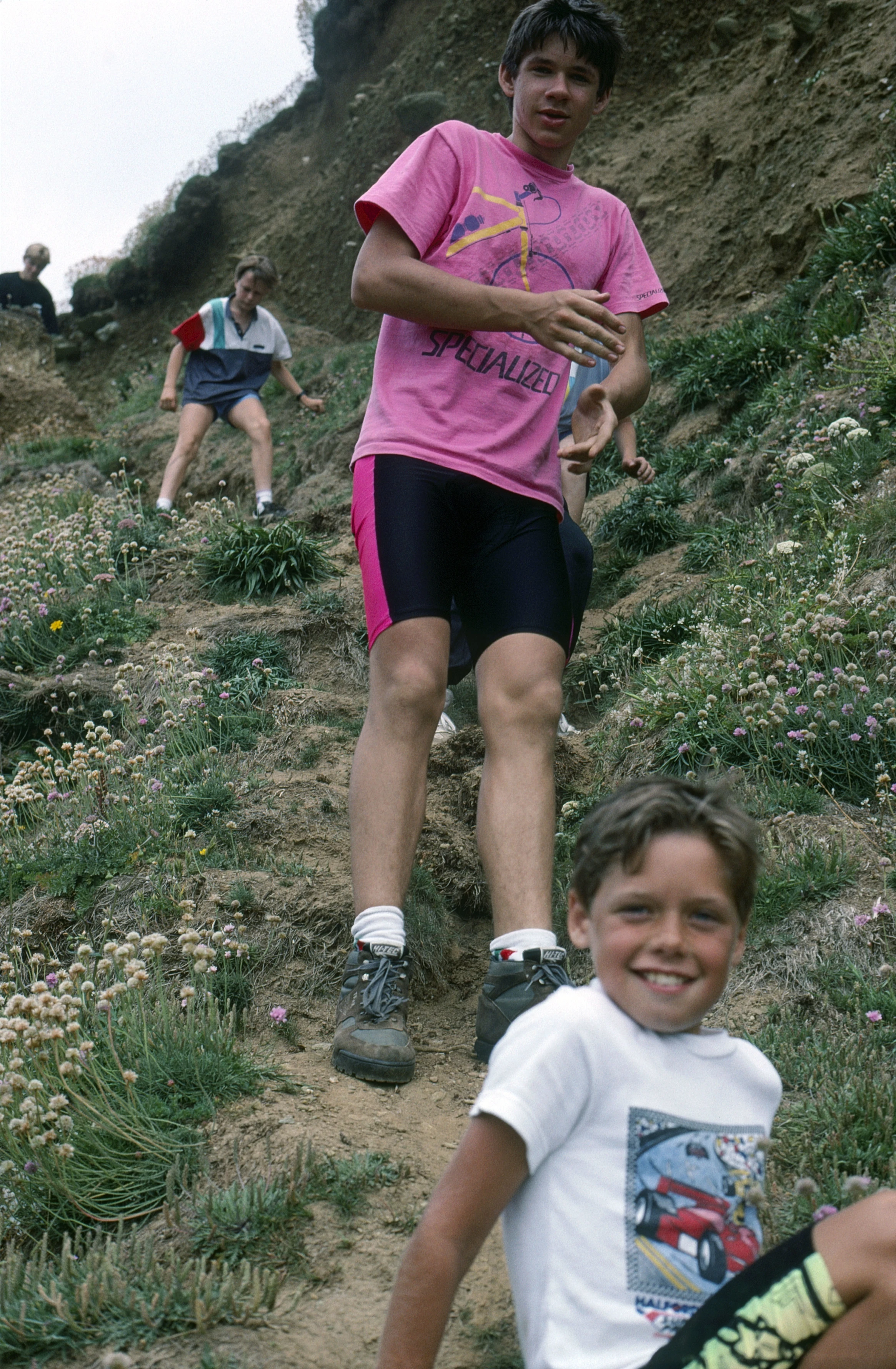 Eliot, Dayle and Martin R scramble down to the cove.
