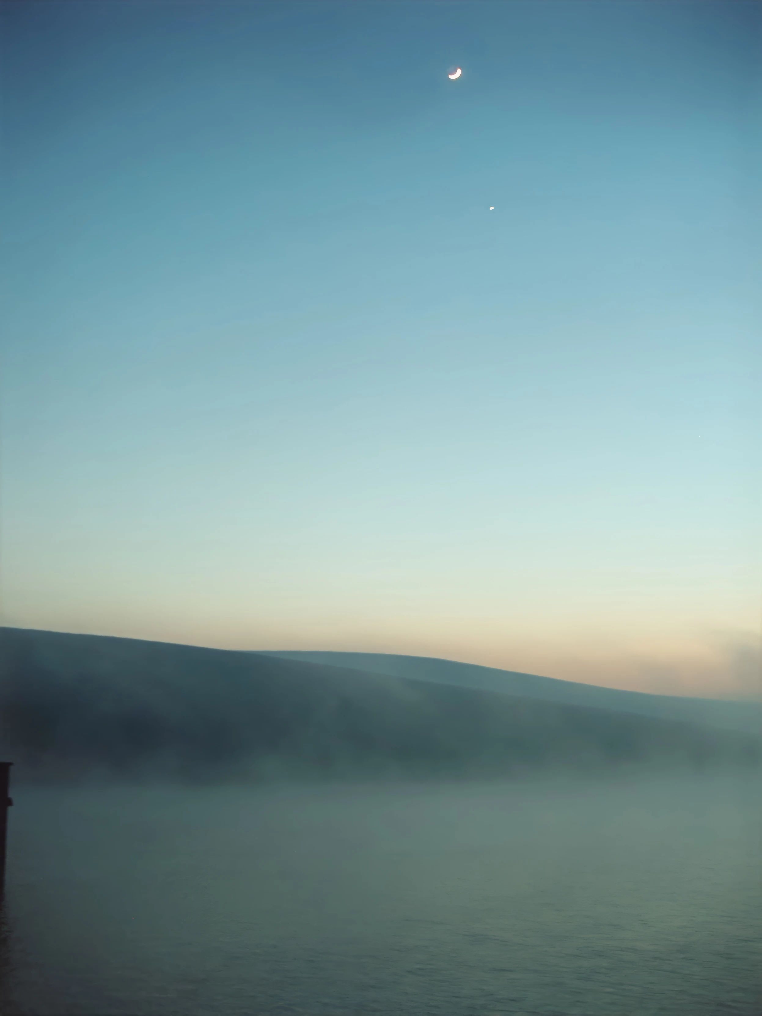 The moon looks on as fog drifts over Avon Dam.