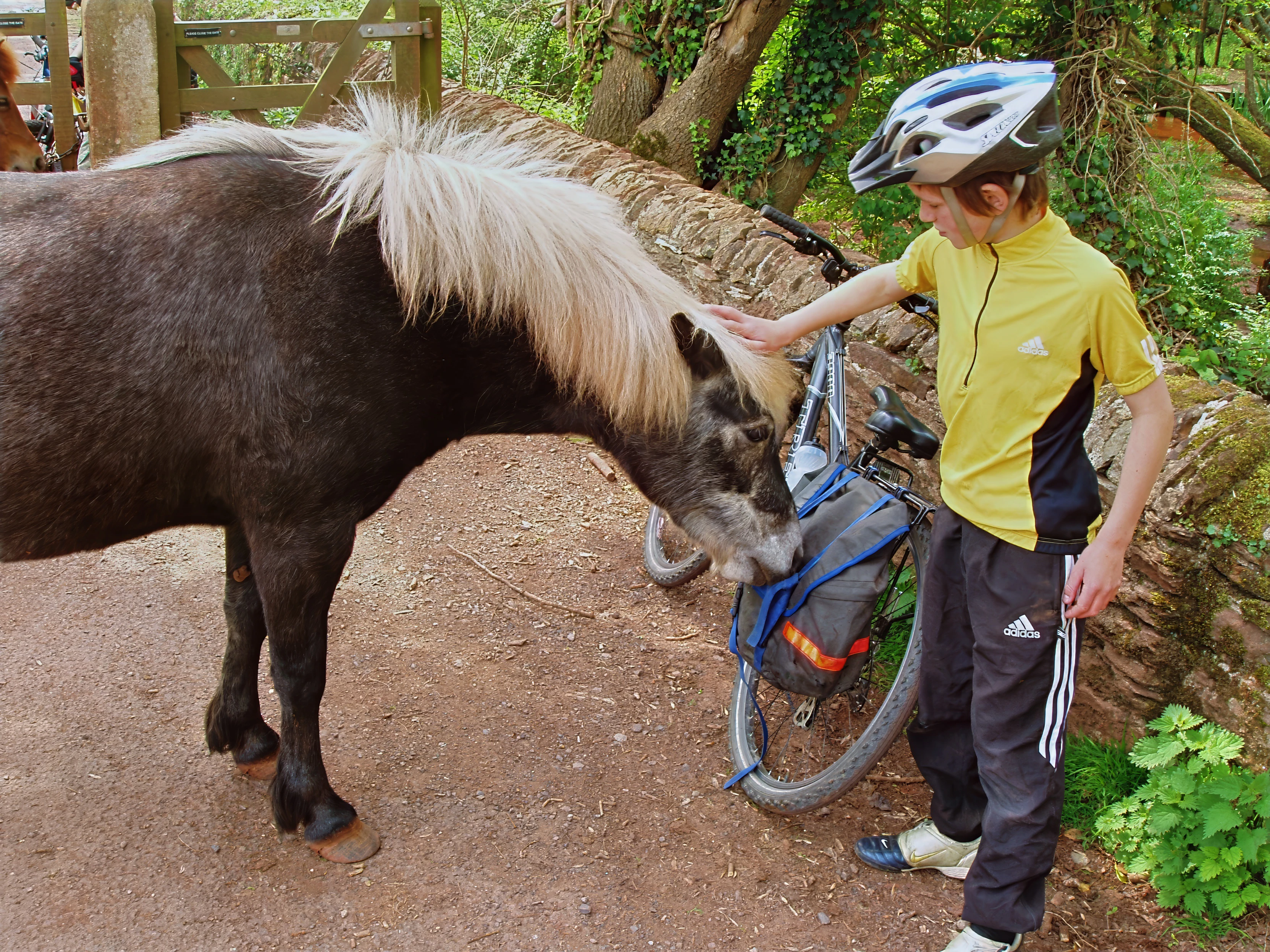 A friendly horse sniffs out food in Michael's pannier