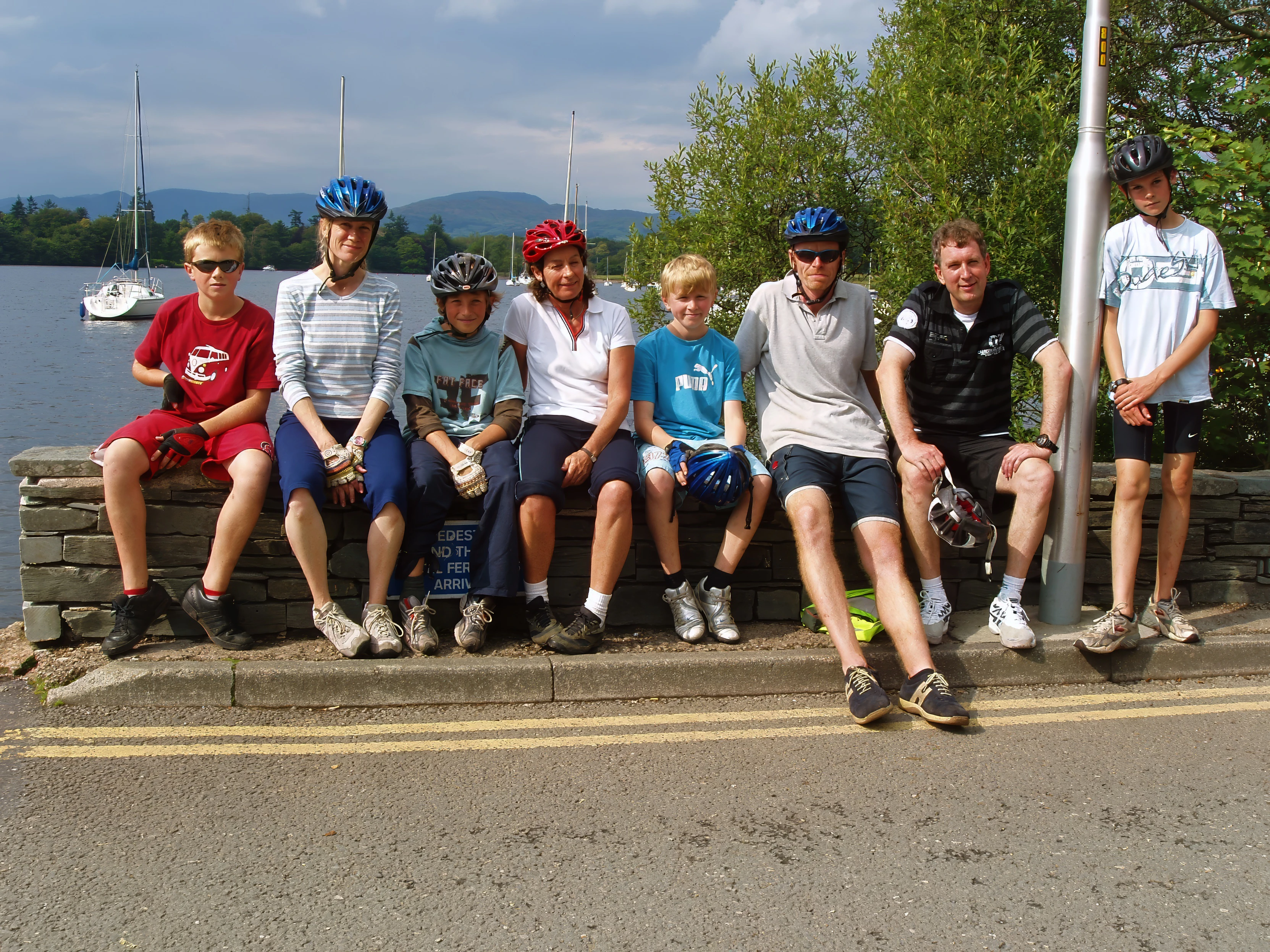 Whole group waiting by the ferry, Bowness Quay—same spot as our 1991 photo.