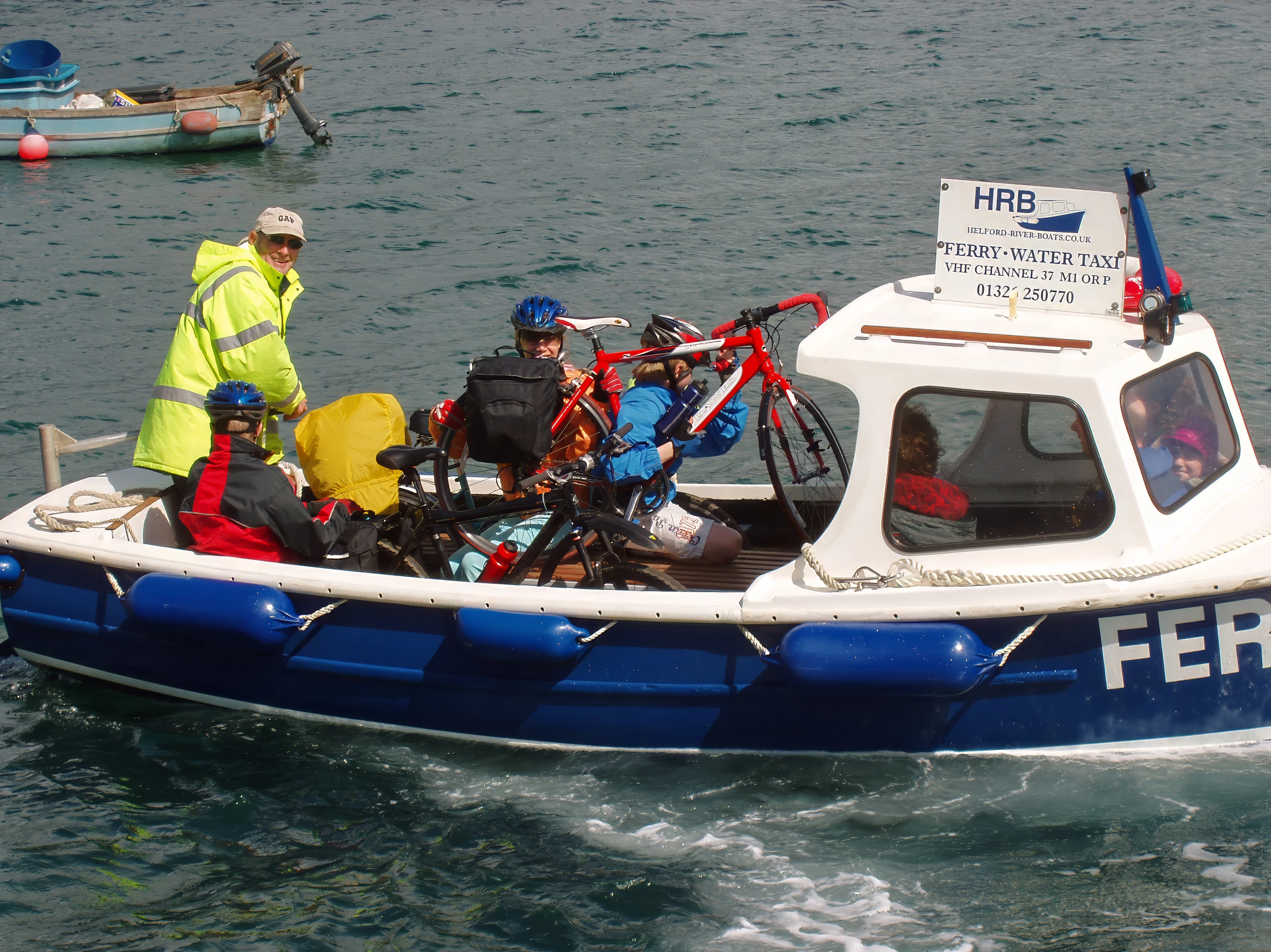 First group boards the tiny passenger ferry from Helford to Helford Passage.