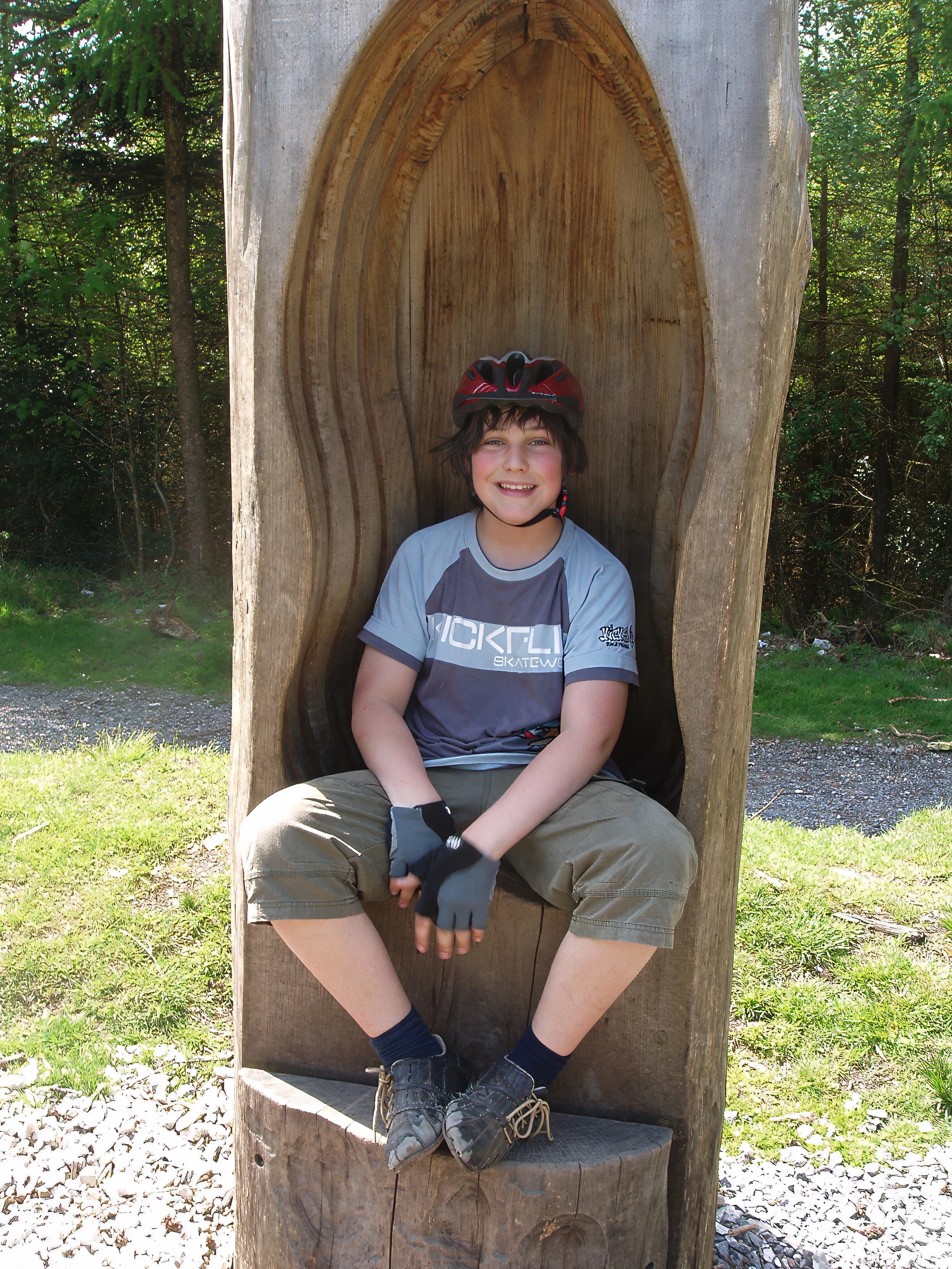 Zac explores the carved chair on the Play Trail