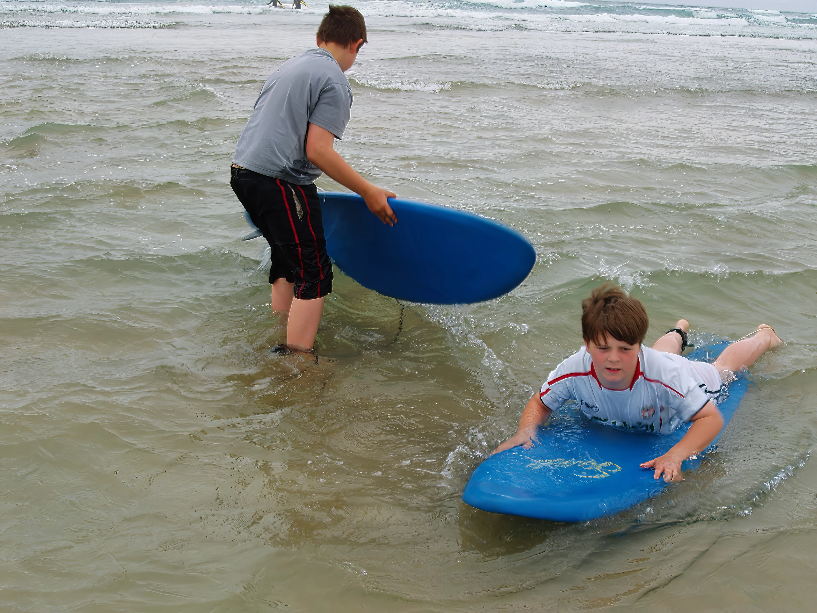 Zac and Ashley get to grips with our rented surfboards at Perranporth.