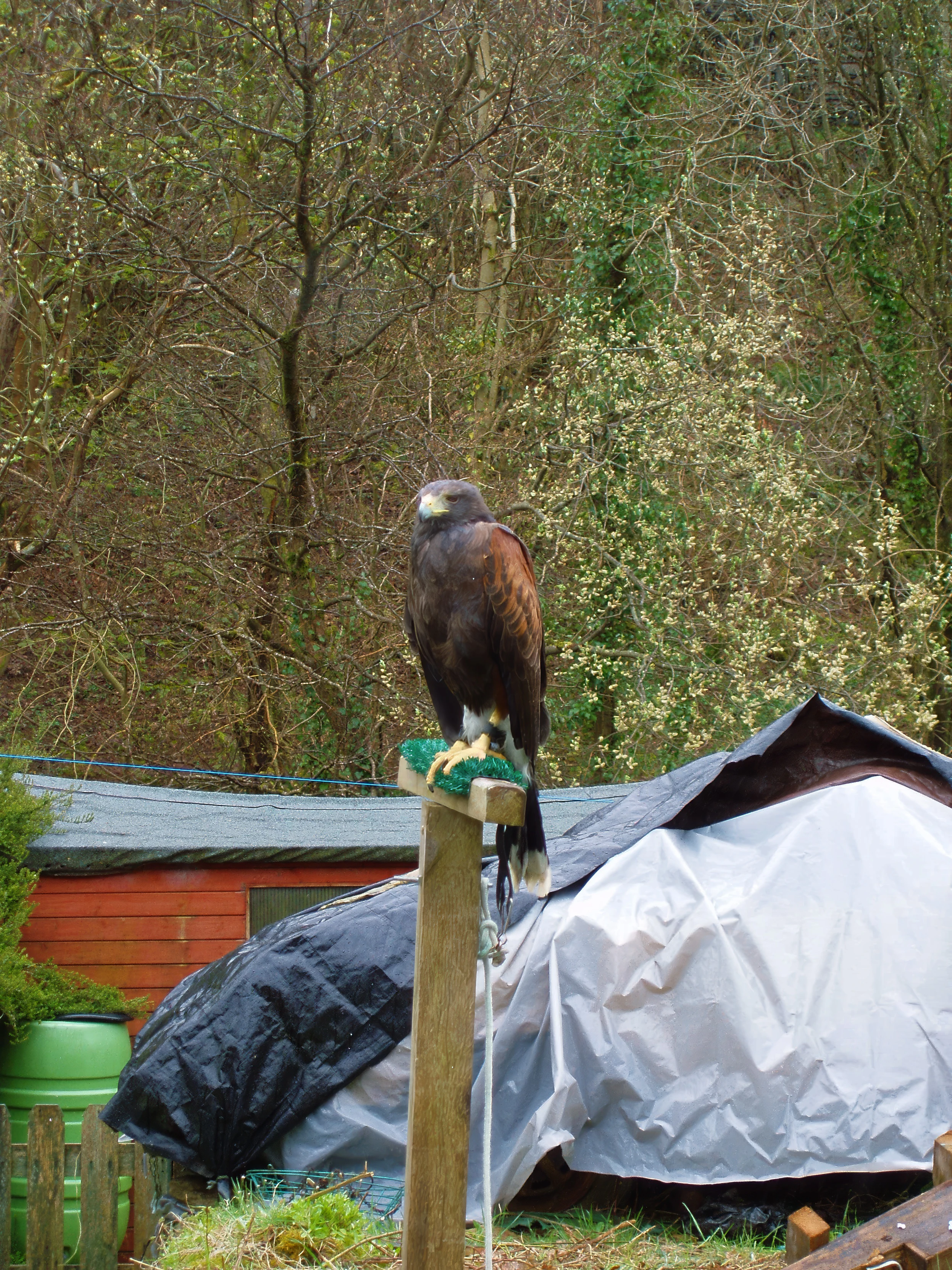 Harris’s hawk in a roadside garden, probably on Lynway; the rain just beginning.