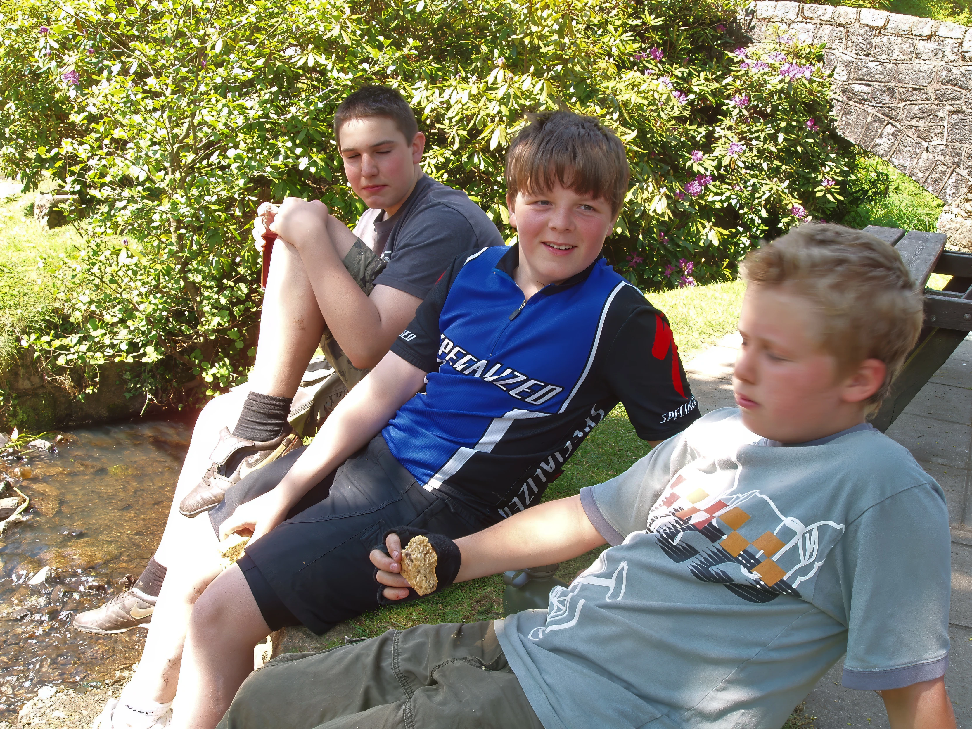 Zac, Ash and Matt enjoying packed lunch by Fingle Bridge.