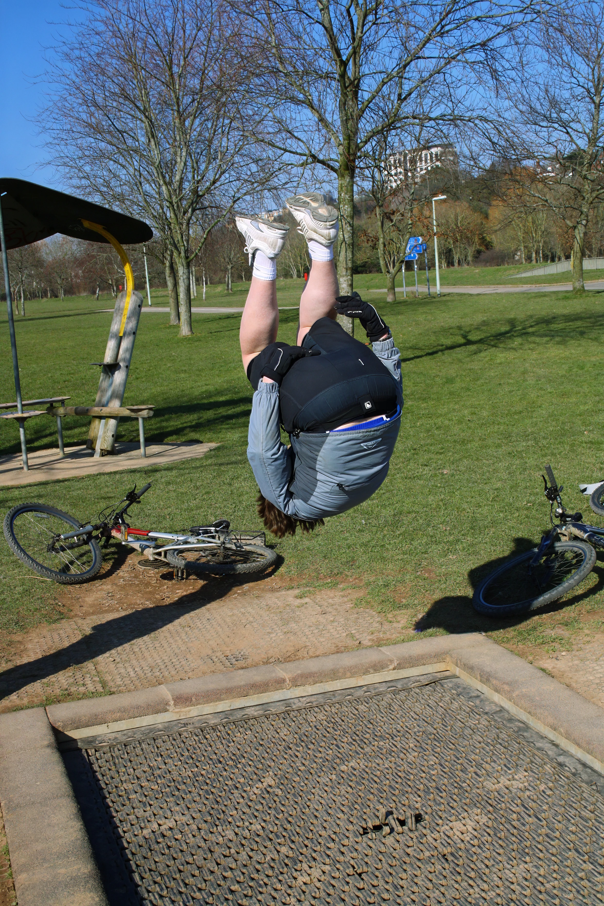 Ash does a backflip on the trampoline