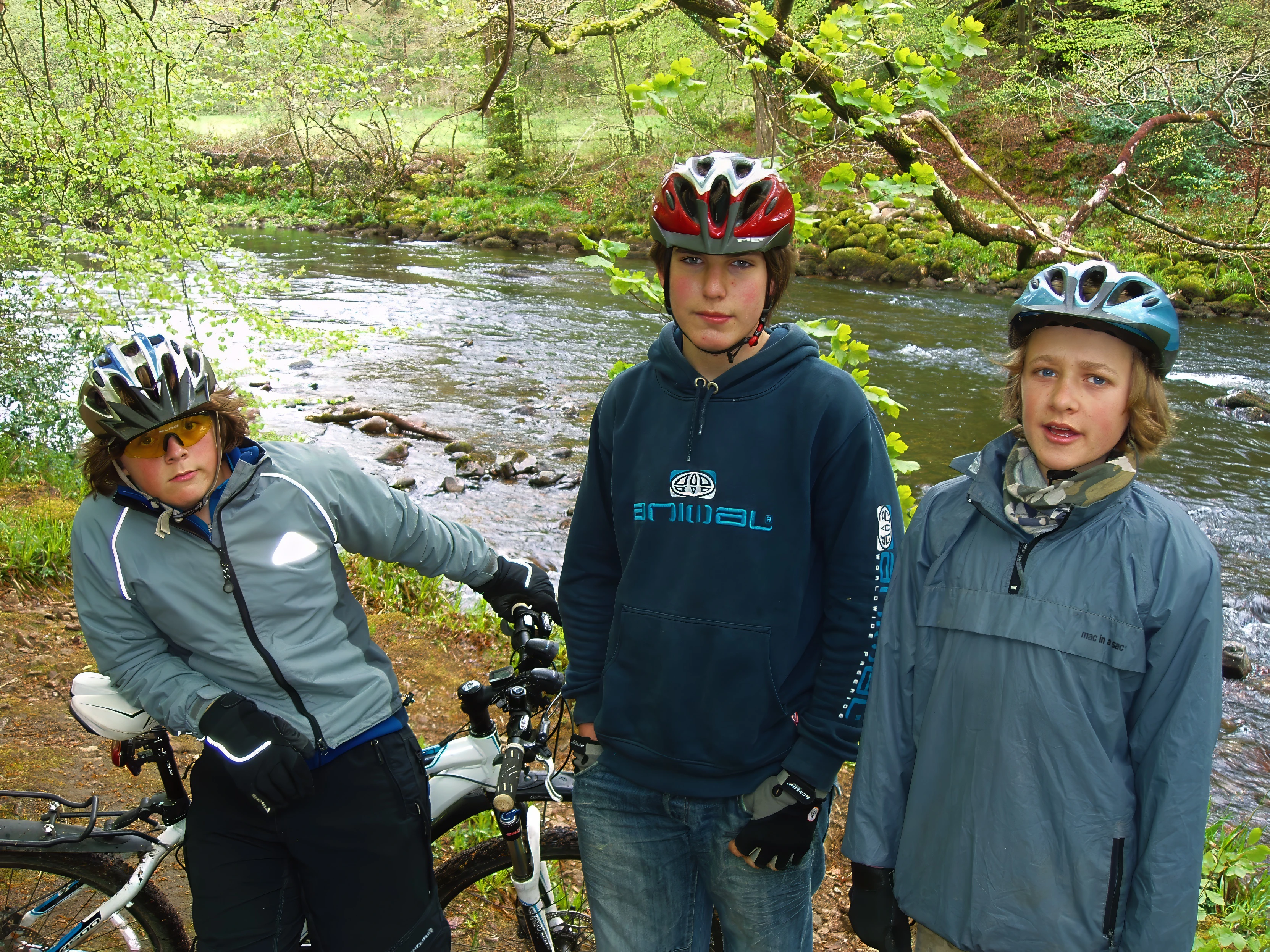 Ash, Zac and Hallam by the River Dart, Hembury Woods.