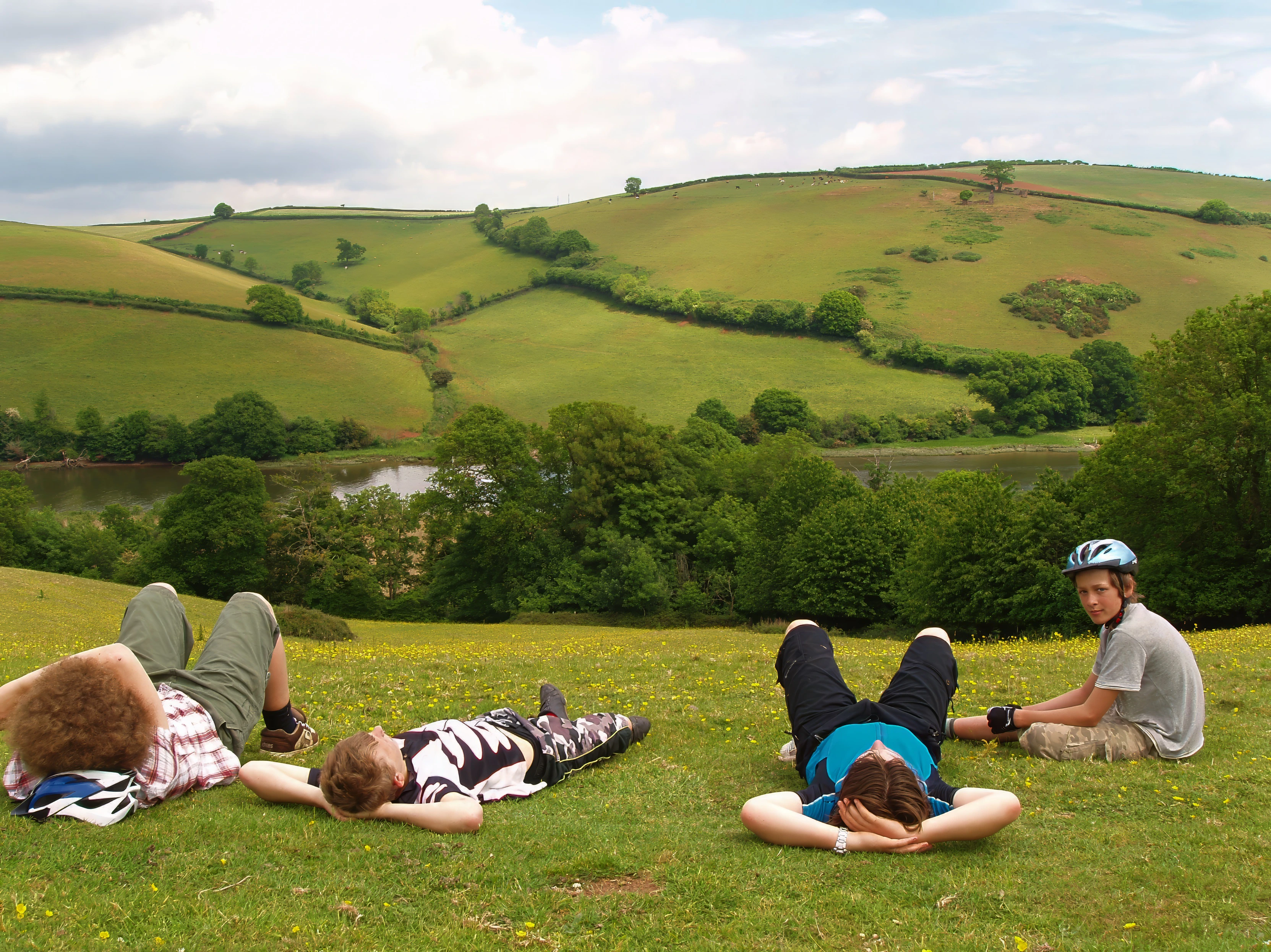 Post-lunch laze among the buttercups on the Ashprington track.