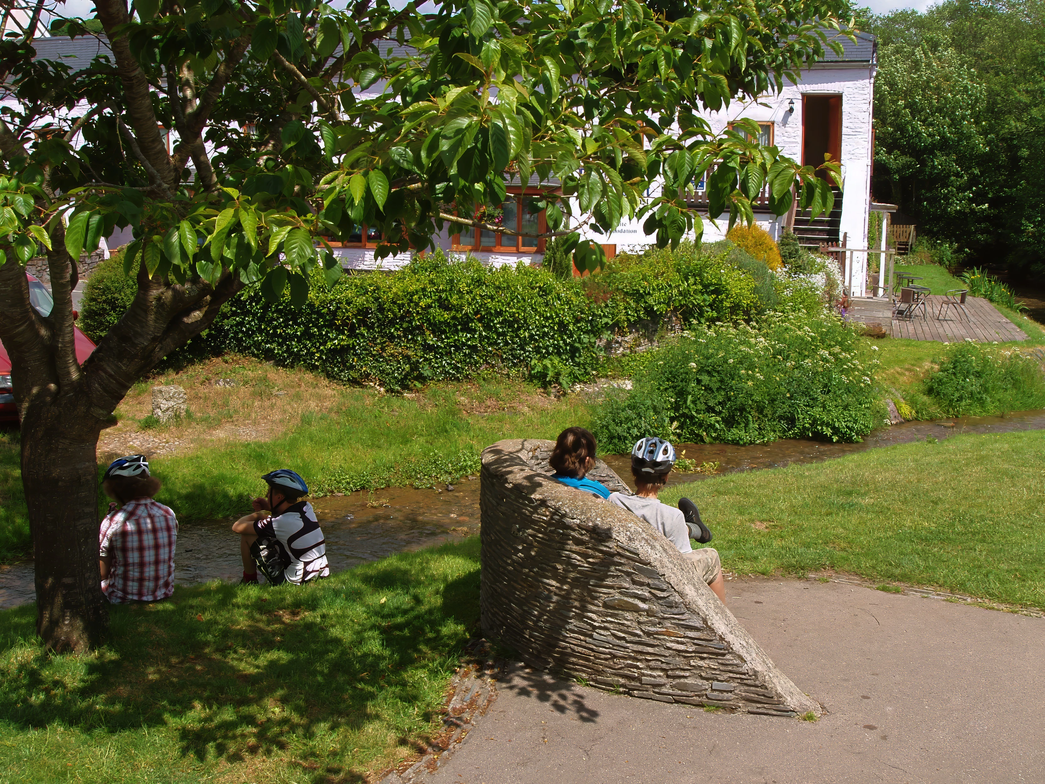 Shady ice-cream stop by the river at Harbertonford.