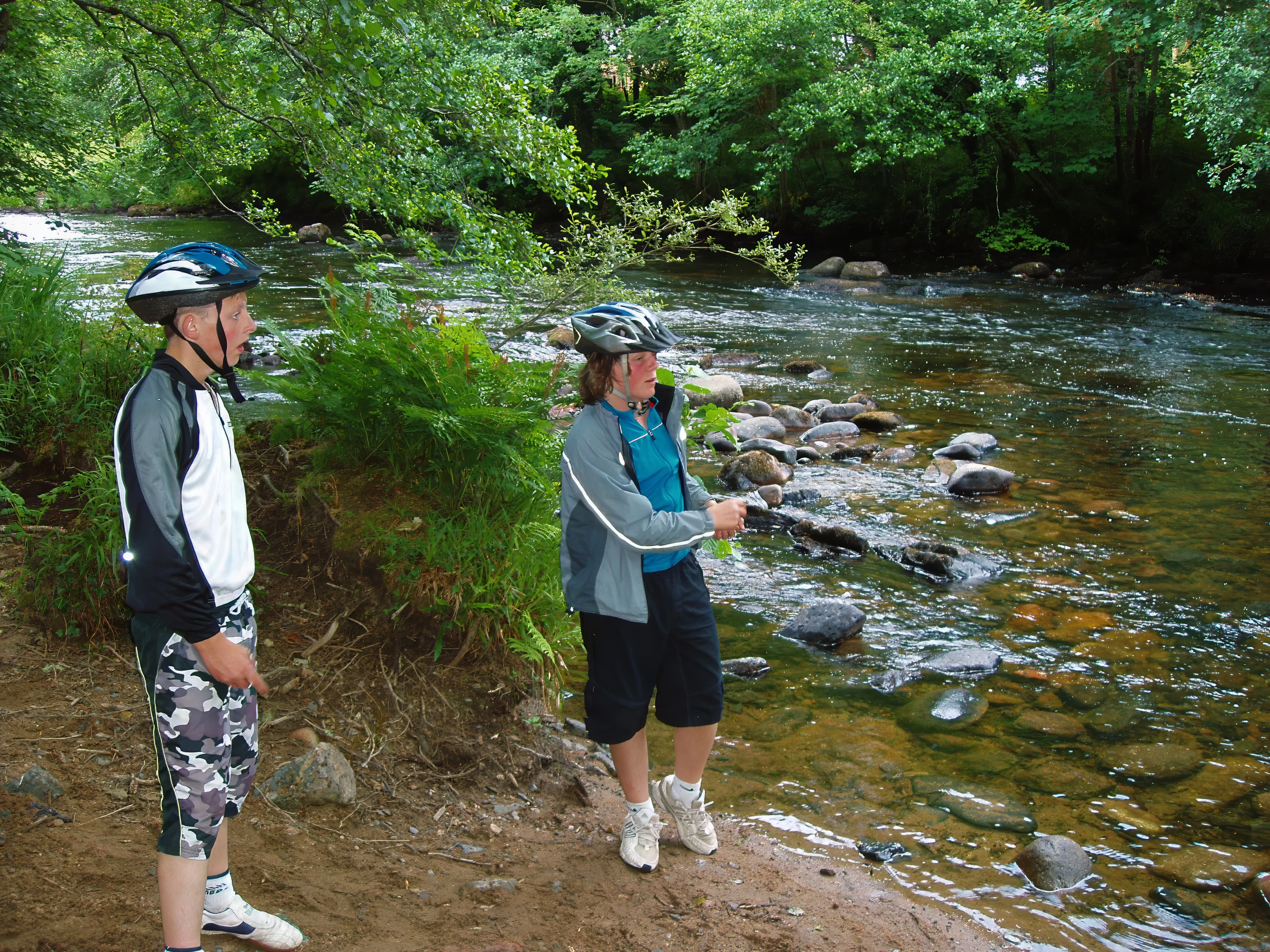 Ash and Callum skim stones across the River Dart, Hembury Woods.