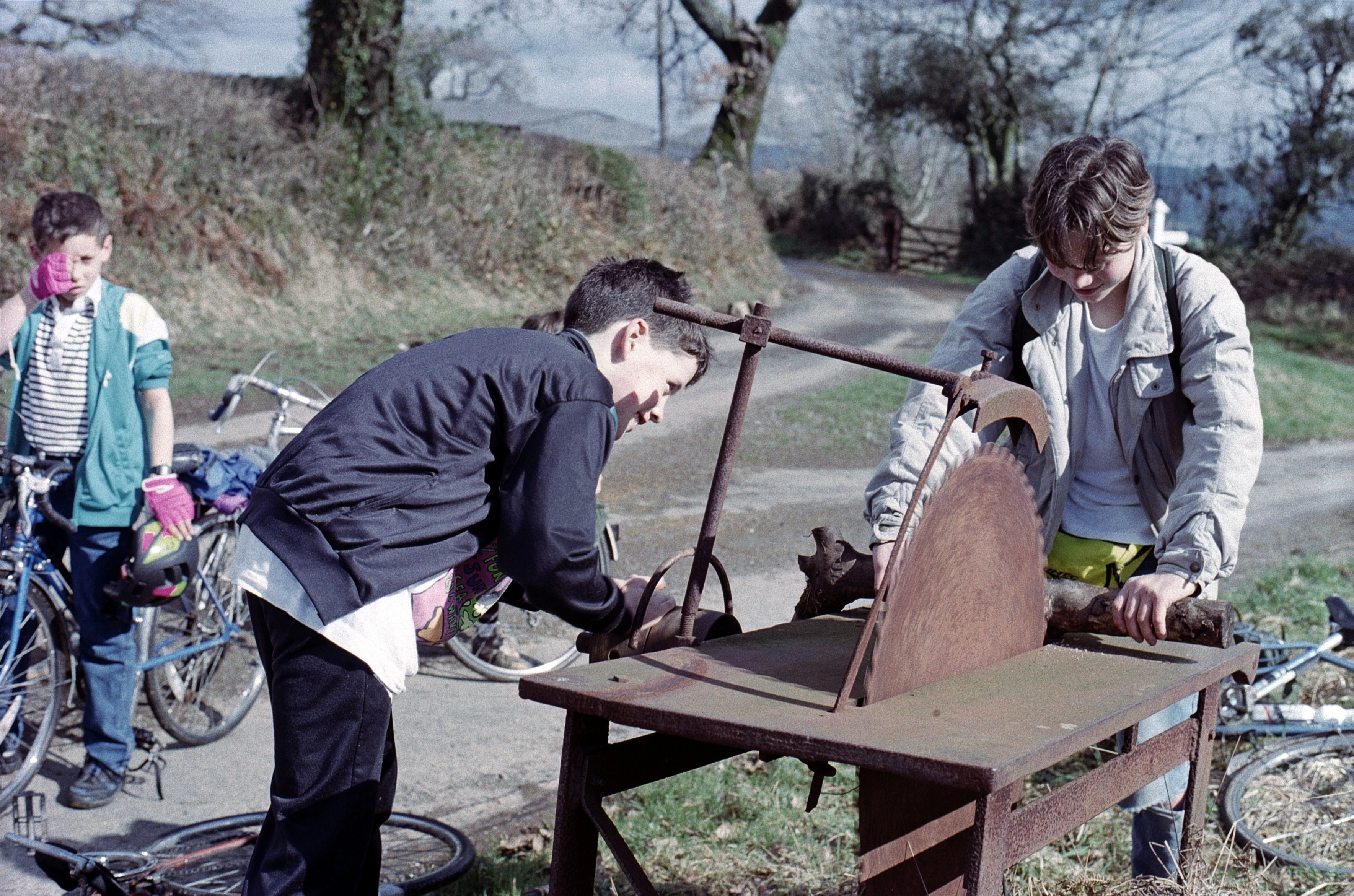 Paul Oakley looks on as Alex Flanagan saws a log, with help from Gavin Taylor, near Addislade.