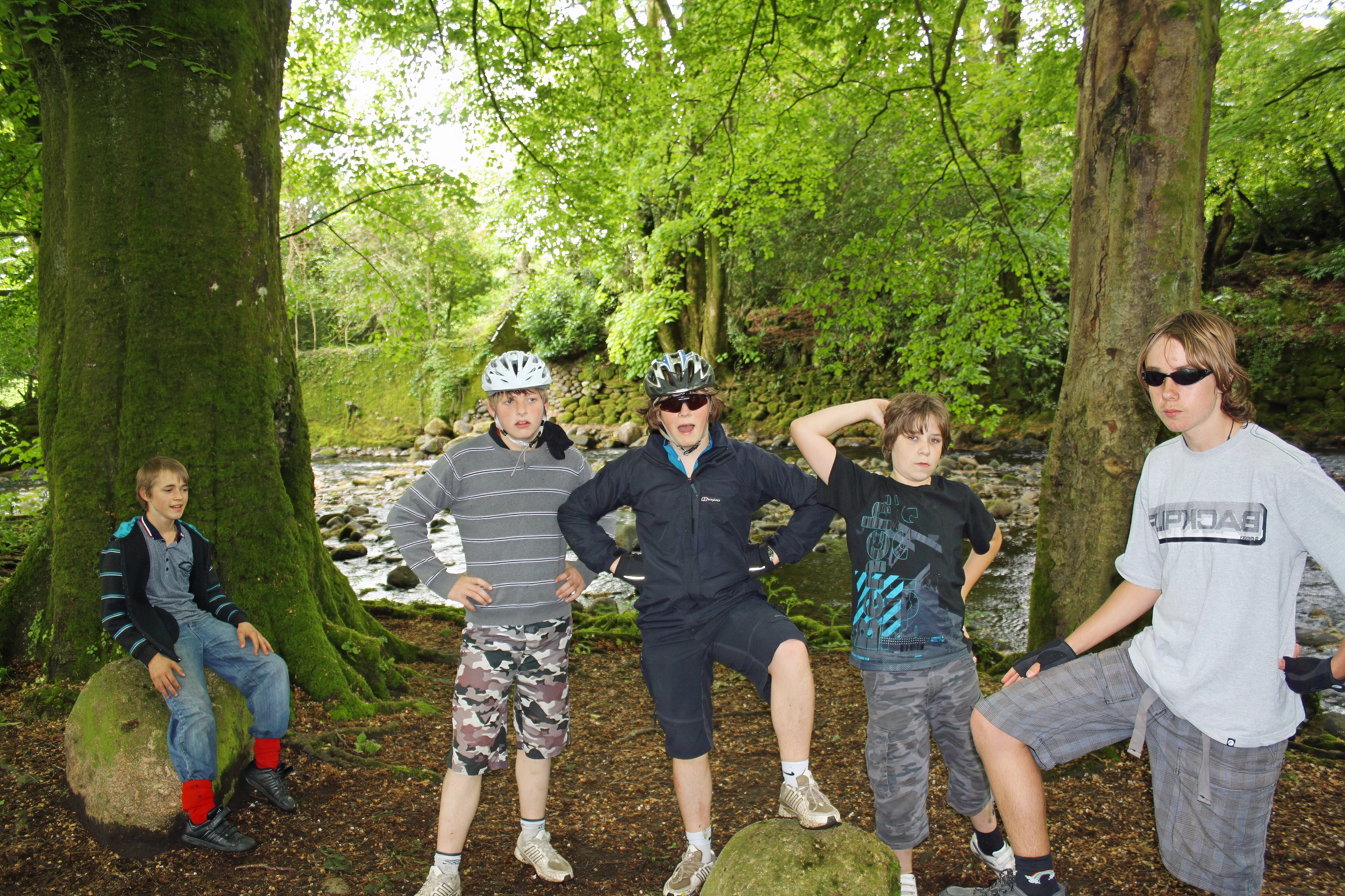 Connor, Callum F, Ash, Callum O'B and Jack by the River Avon, near South Brent