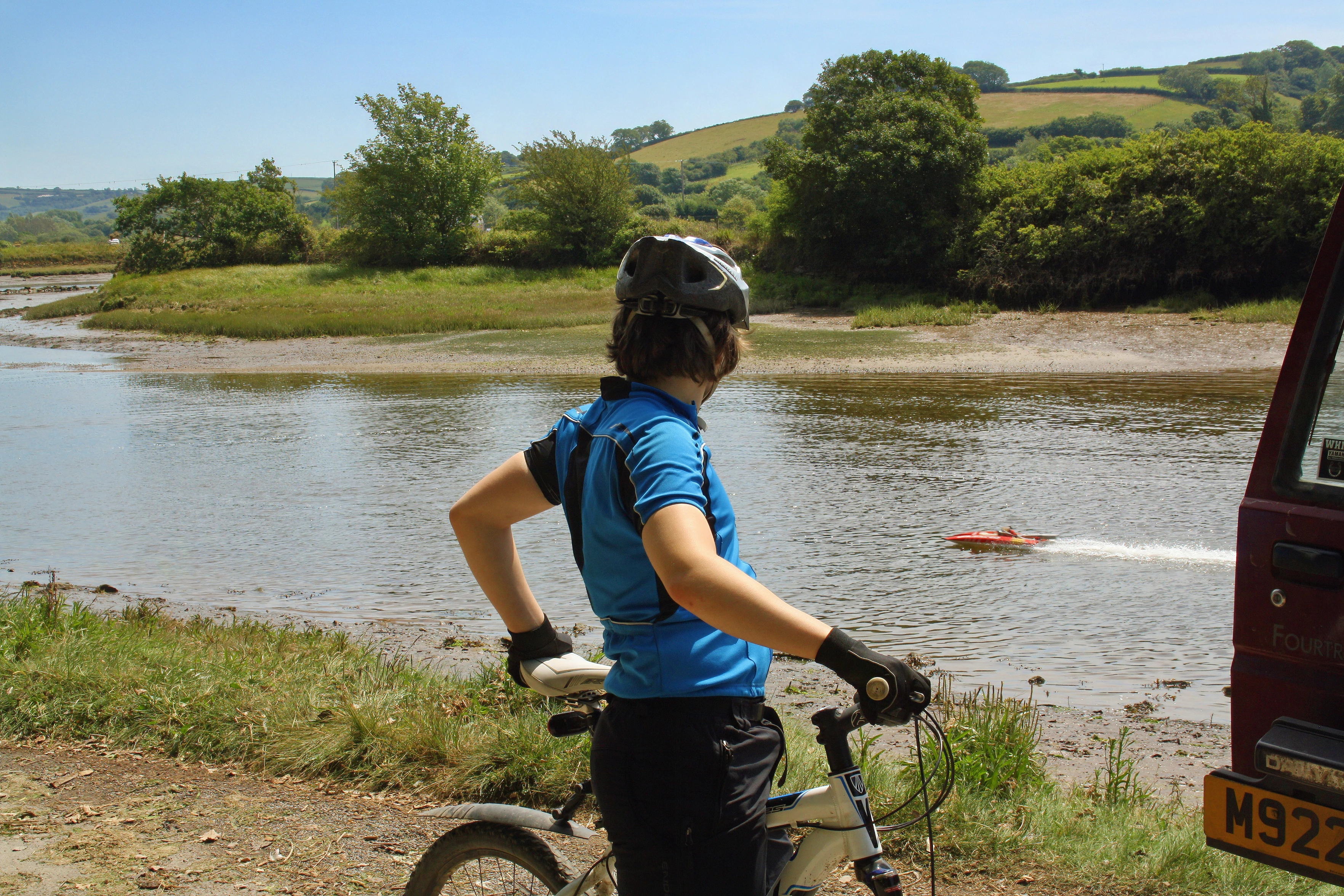 Ash watches a radio-controlled speedboat heading up the Avon estuary