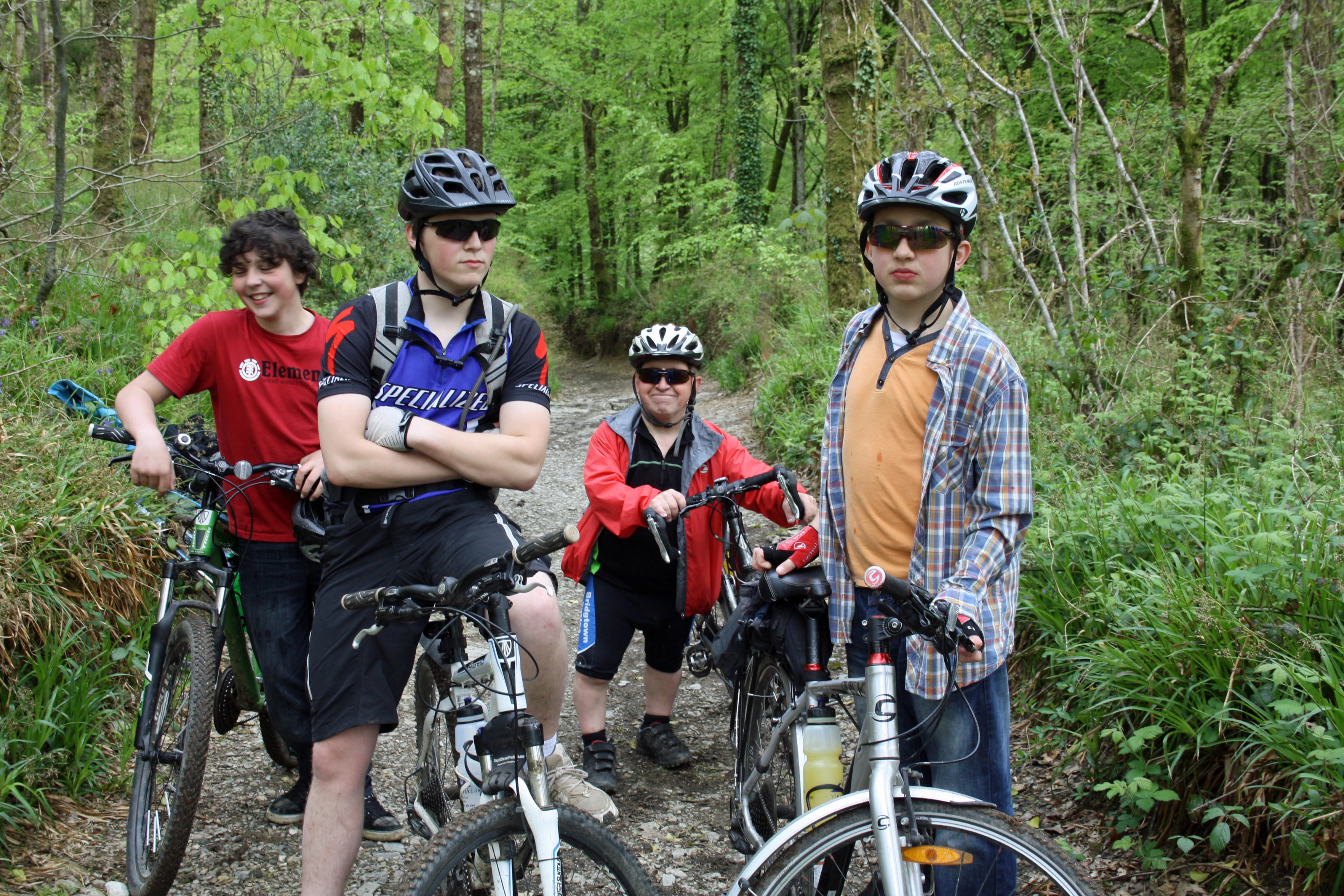 Lawrence, Ash, John and Will at the bottom of the 'Slalom' track, Hembury Woods.