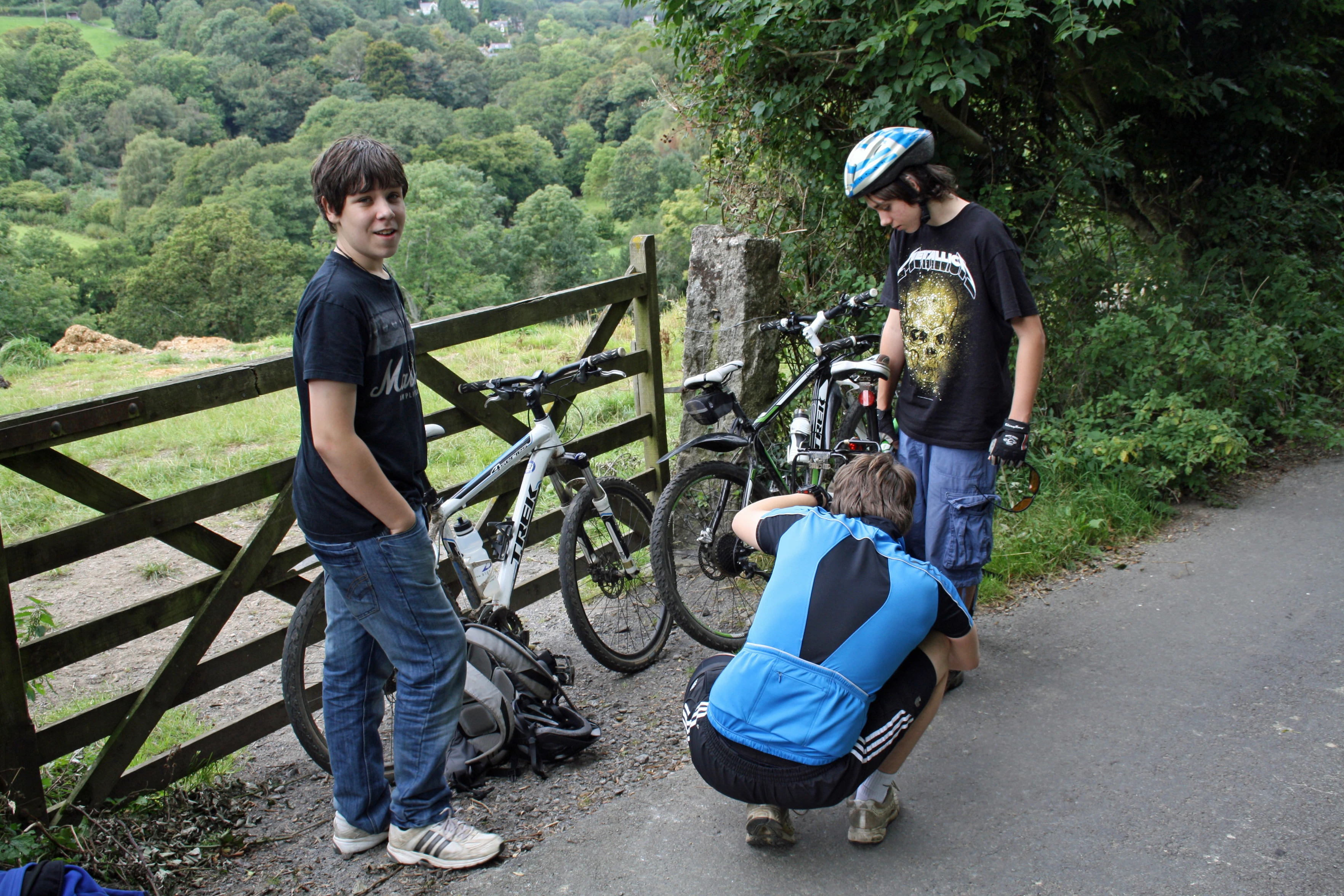 Fixing Callum’s puncture on the lane to Lustleigh.
