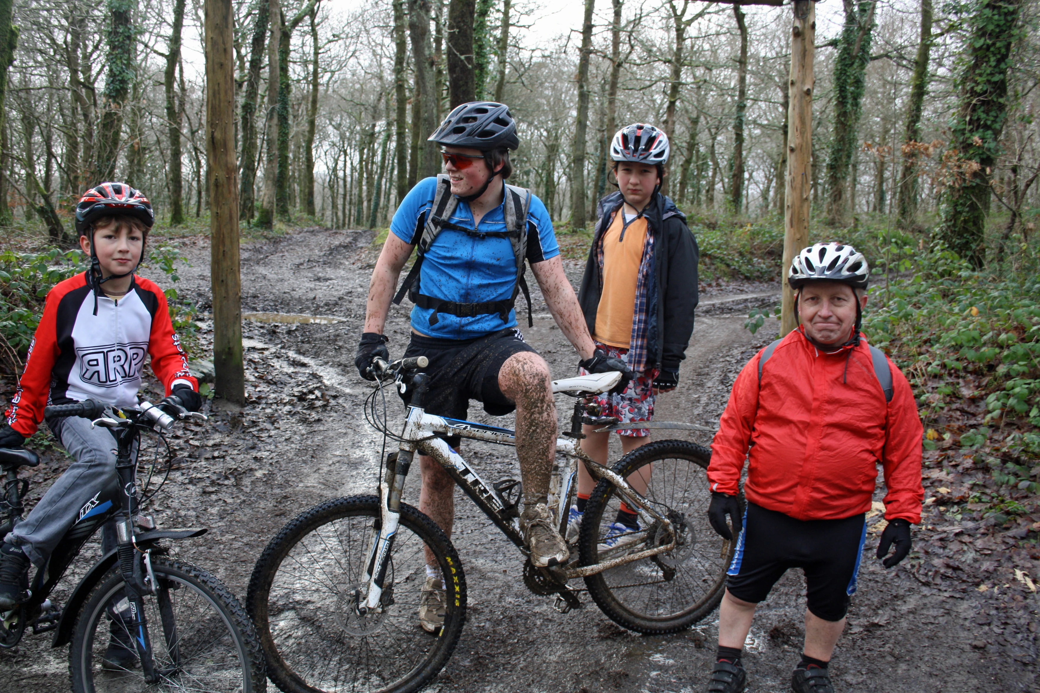 Ash, plastered in mud after riding the slalom track at Hembury Woods.