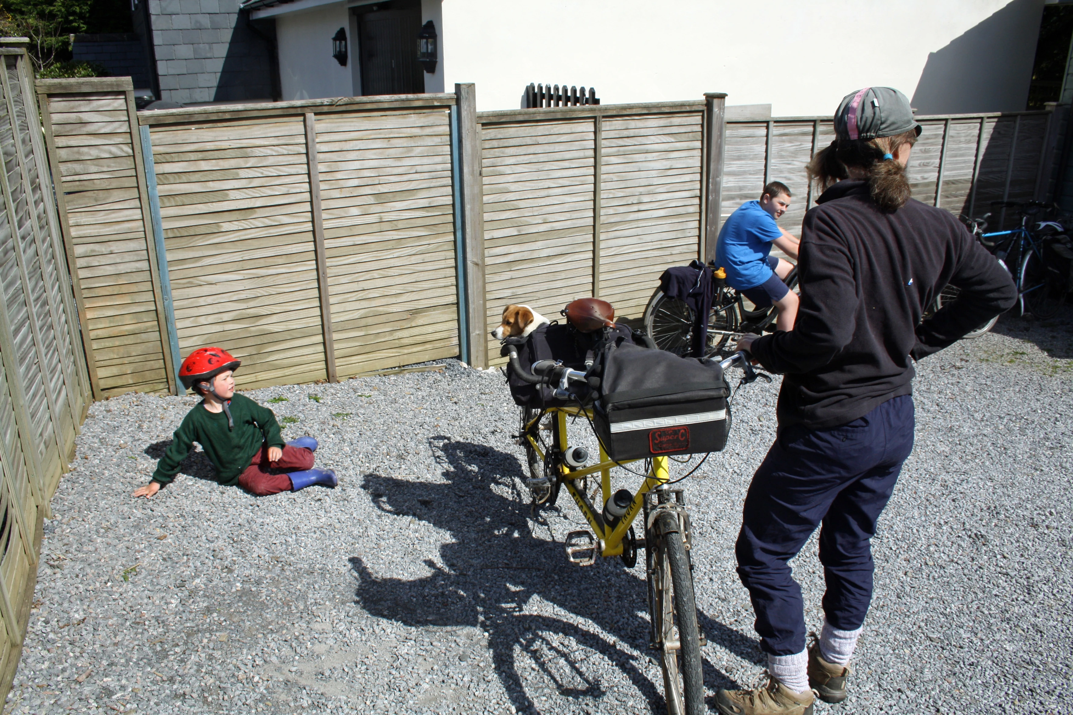 An unconventional way to carry child and dog on a tandem at Holne café.