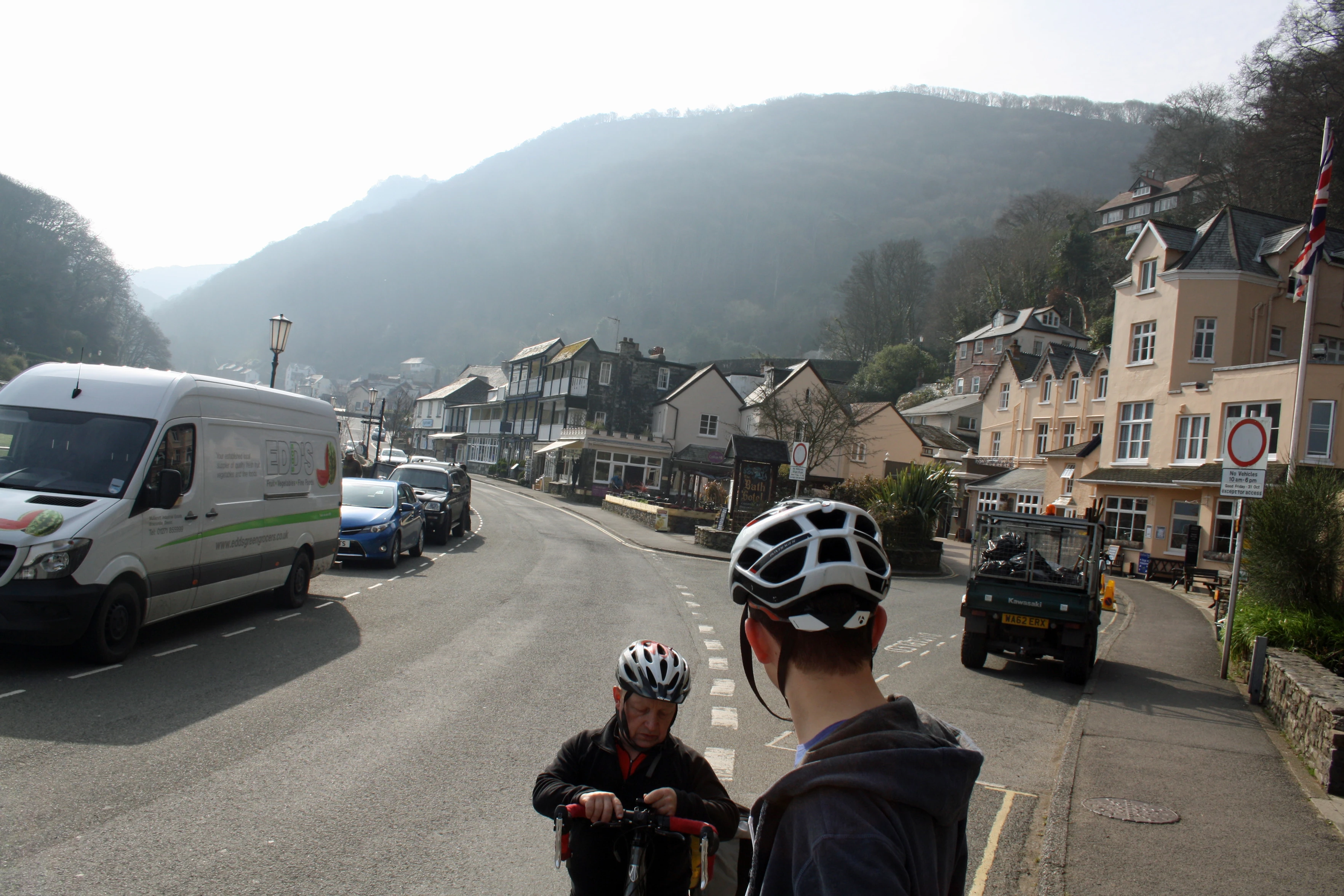 John and Will in Lynmouth, looking back to the Bath Hotel