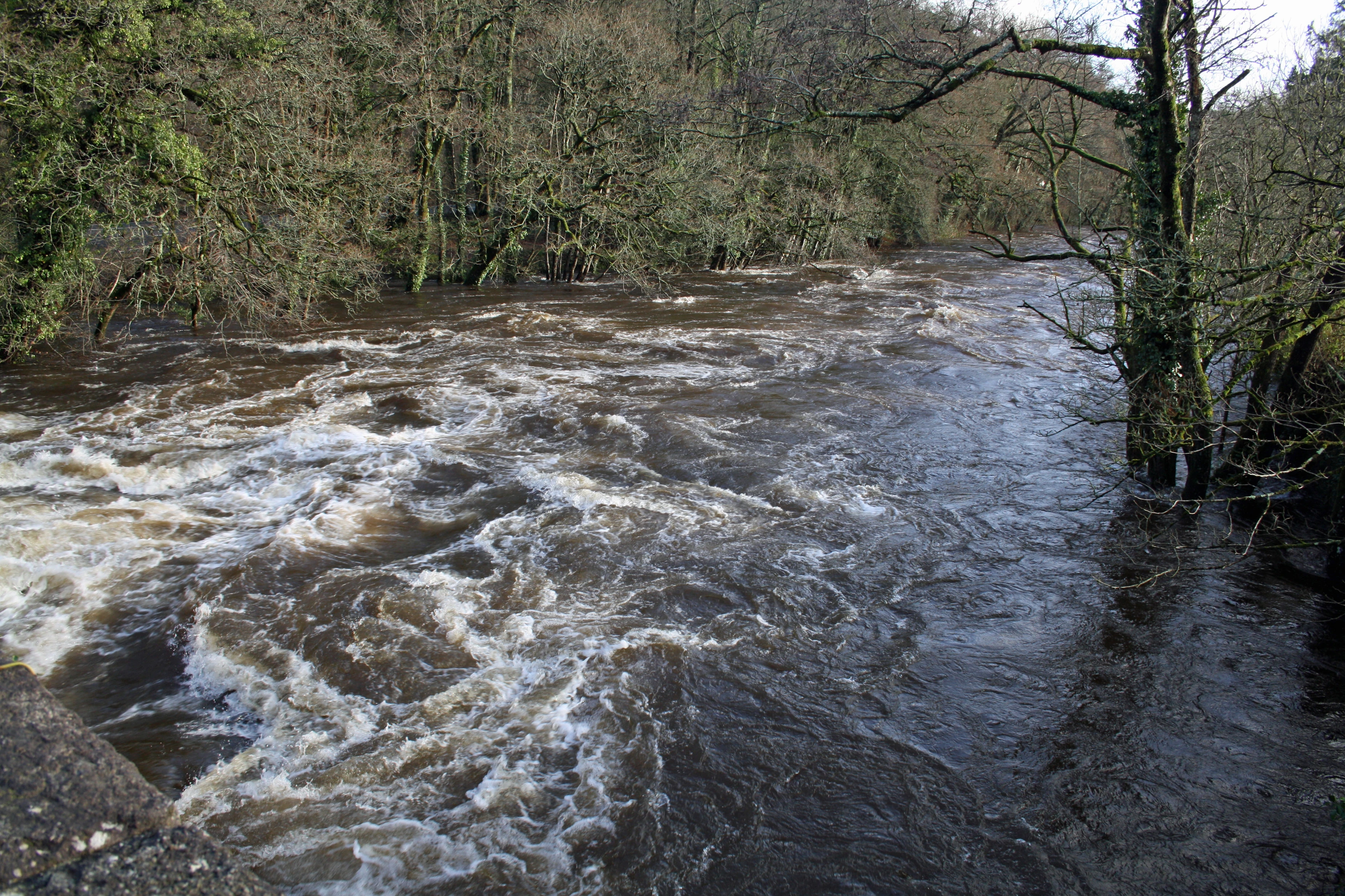 River Dart in full flood, looking downstream from Austin's Bridge, Buckfastleigh.