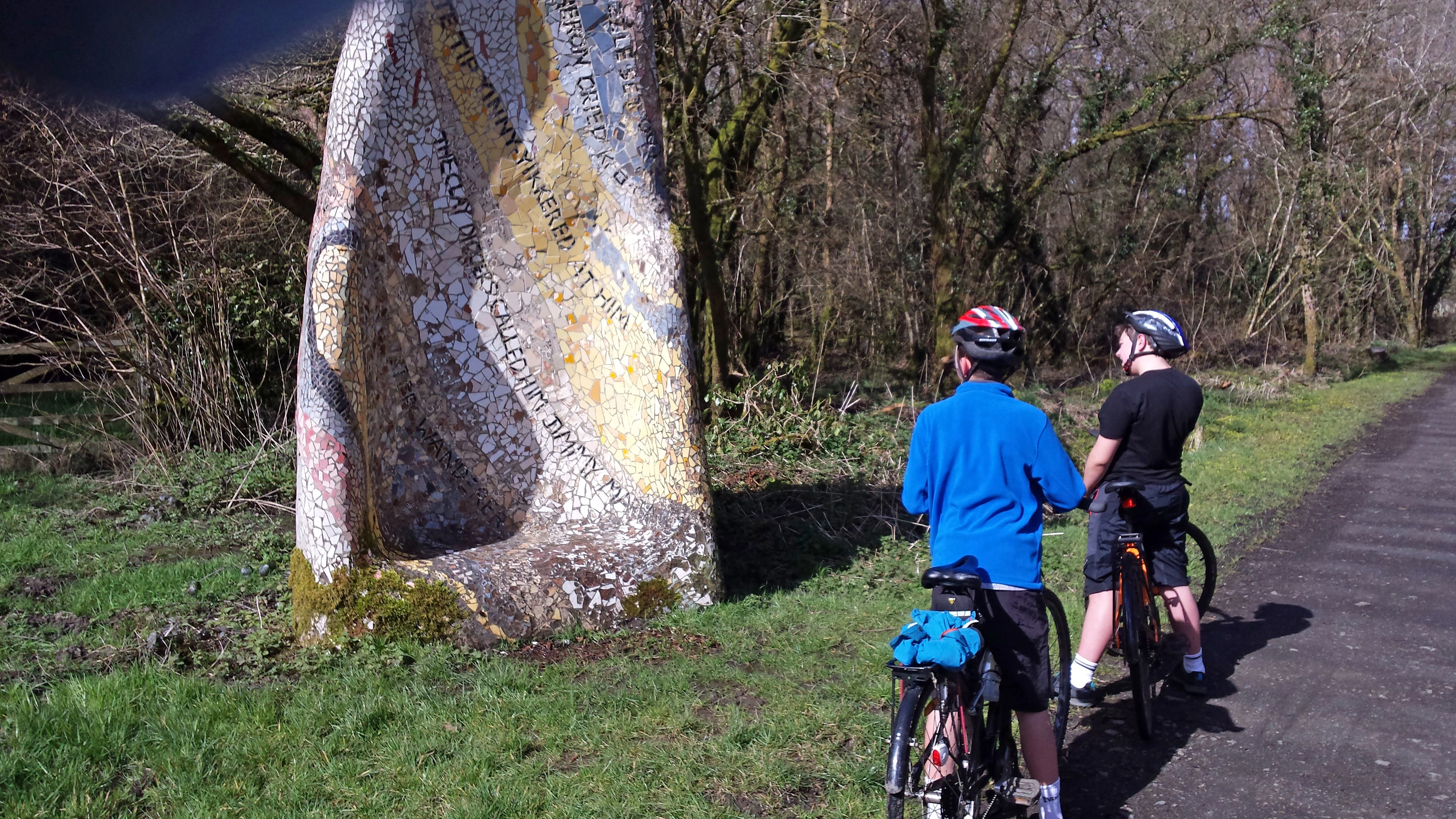 George and Dillan admire the Tarka Trail mosaic featuring Tarka the Otter quotes, 4.7 miles in.