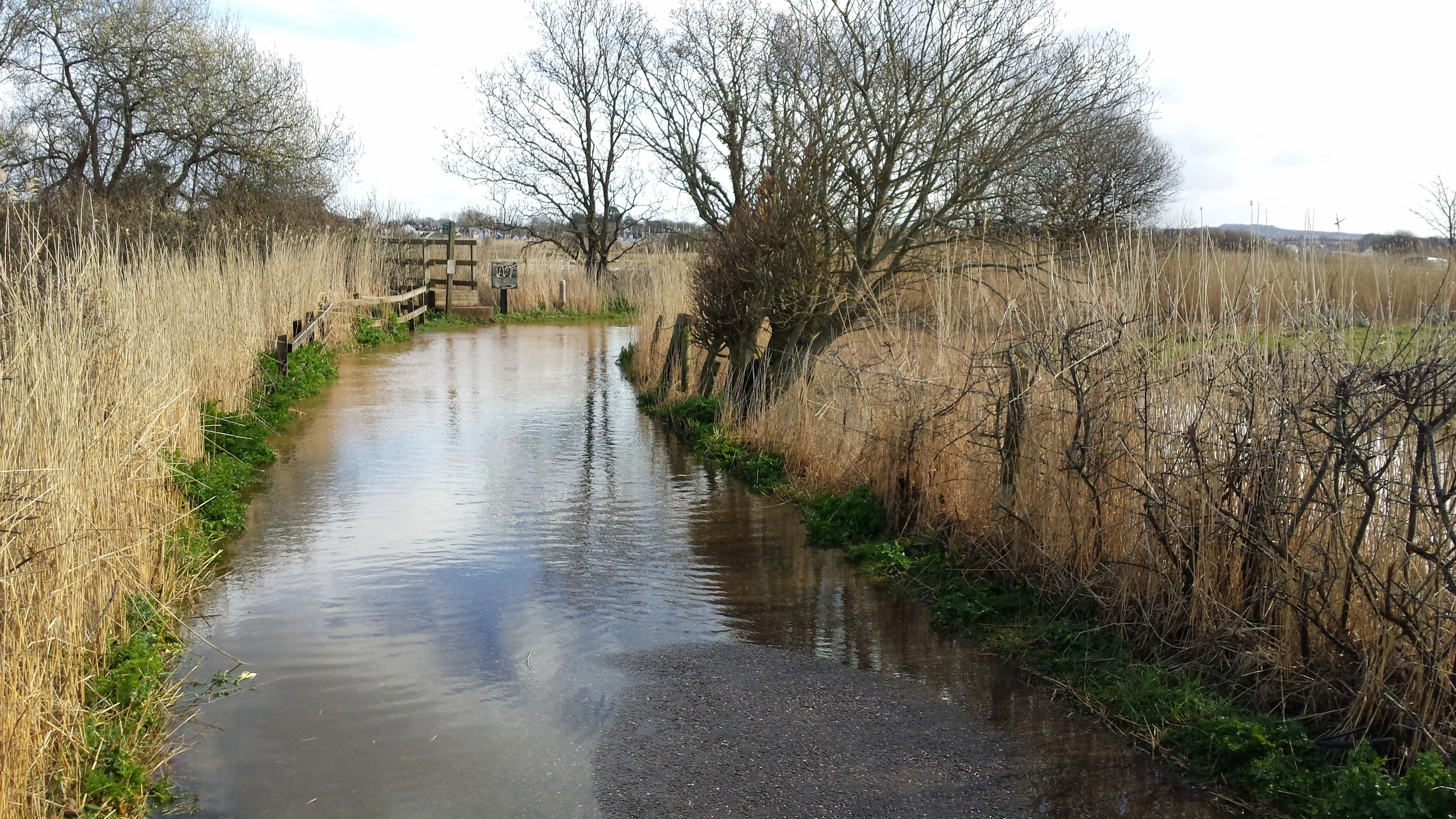 Flooded lane from Exminster car park to the canal; detour via Countess Wear.