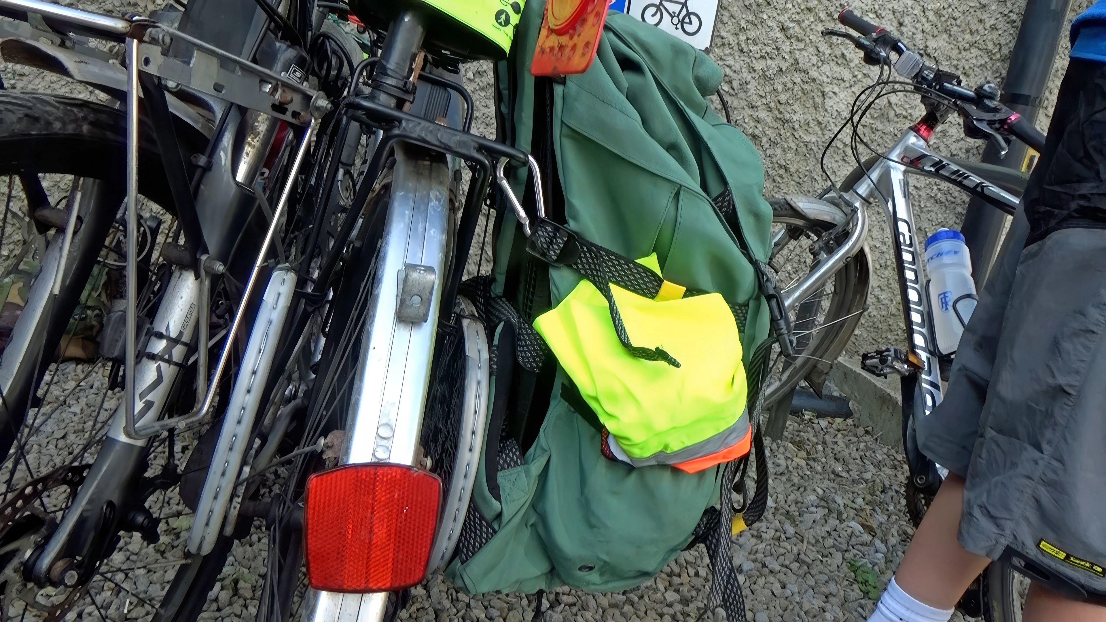 Another hosteller straps a rucksack to his bike with squash rackets.
