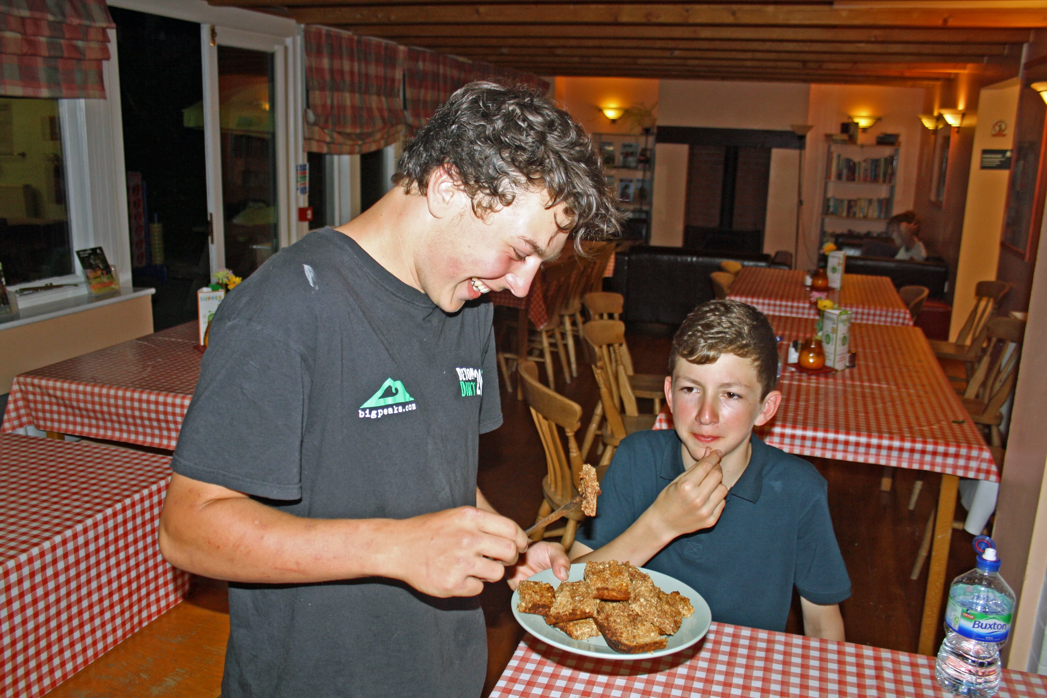 Lawrence samples his home-made flapjack for Michael’s birthday at Helmsley Youth Hostel