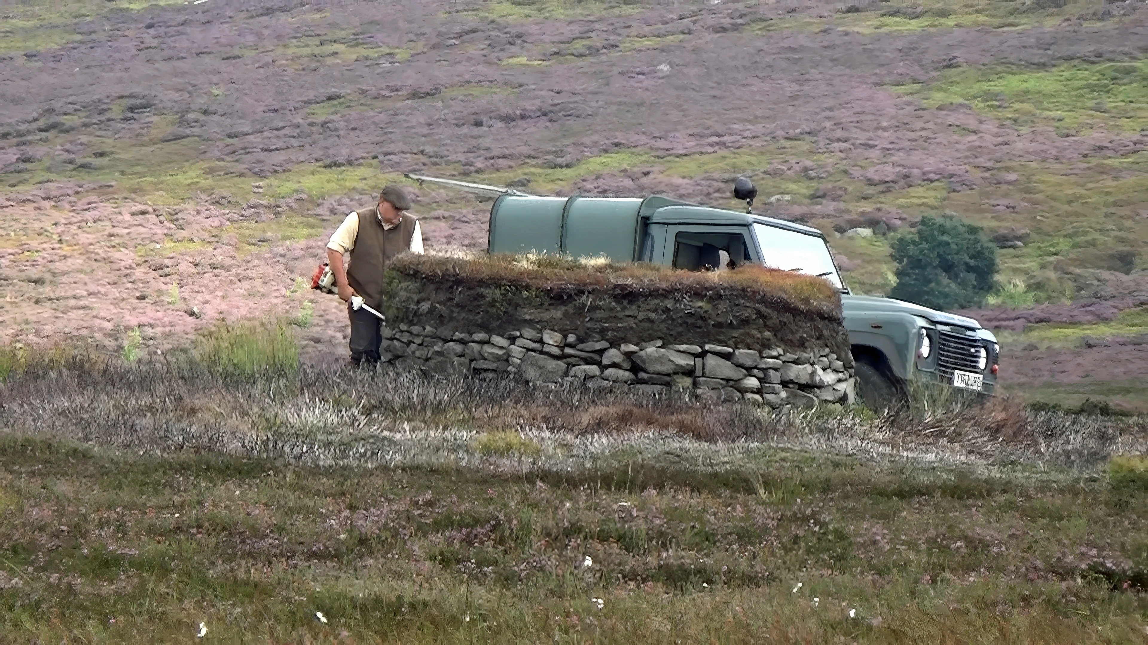 Landowner strims a grouse hide (butt) before the descent to Egton Bridge, 21.5 miles in.