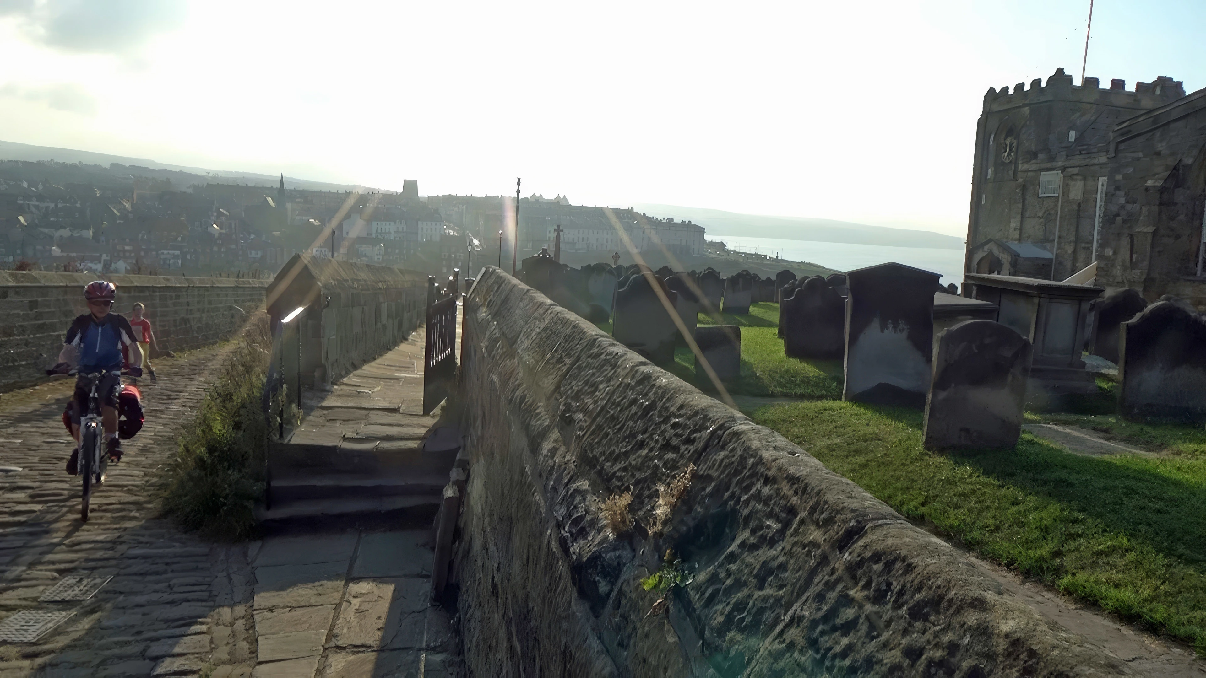 George tops out on the steep Church Lane climb, Whitby—near the hostel.