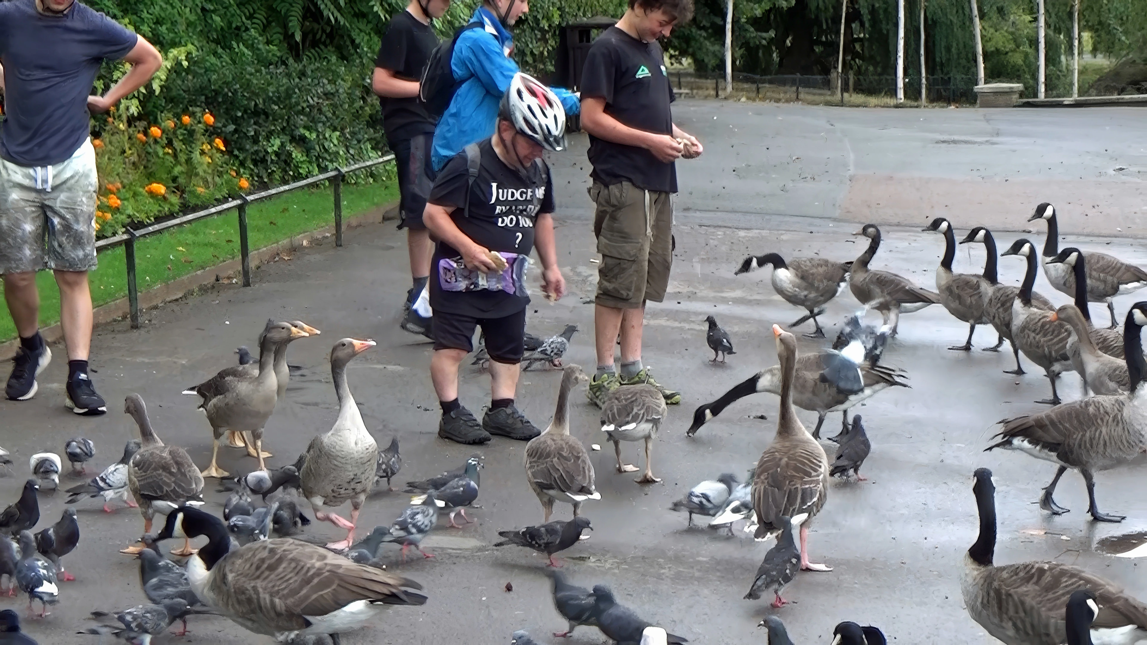 Feeding birds beside the Boating Lake, Regent’s Park, London