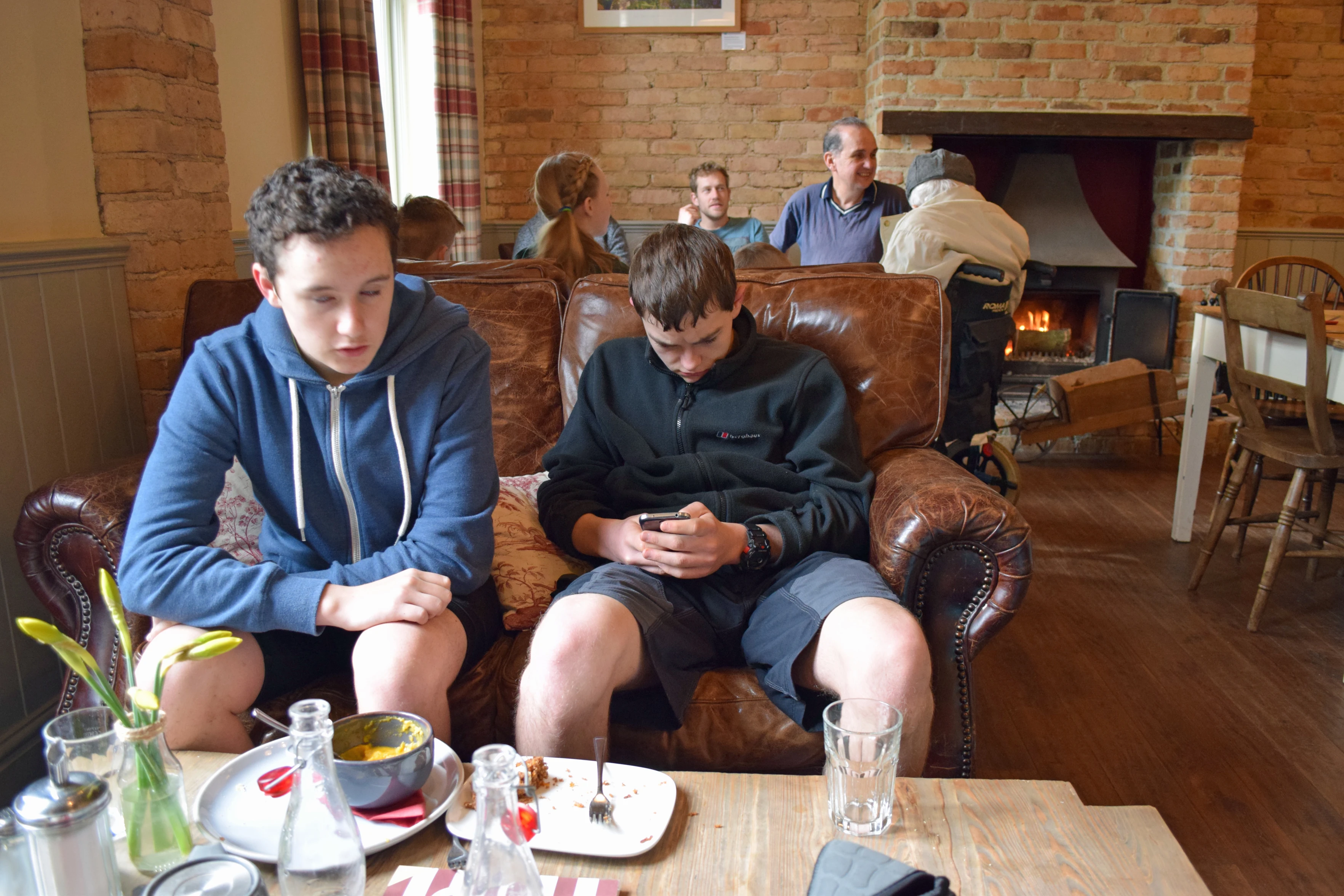 Jude and Dillan thaw out at the Café on the Green, Widecombe.