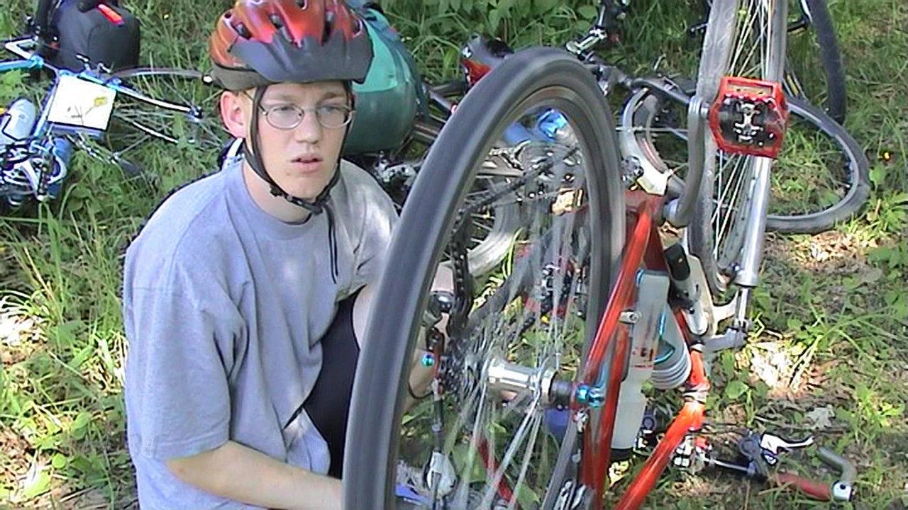 Oliver tweaks his rear brakes at Ryfylkeveien 90 beside Storavatnet, 18.9 miles in.