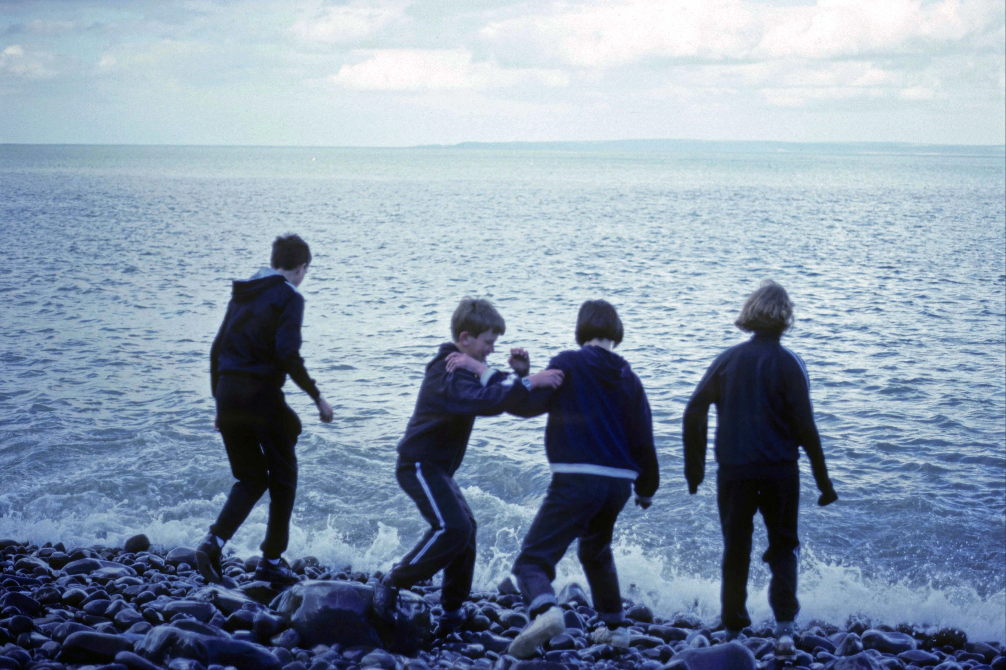 Our youngsters playing chicken on Clovelly's pebbly beach as the breakers roll in.
