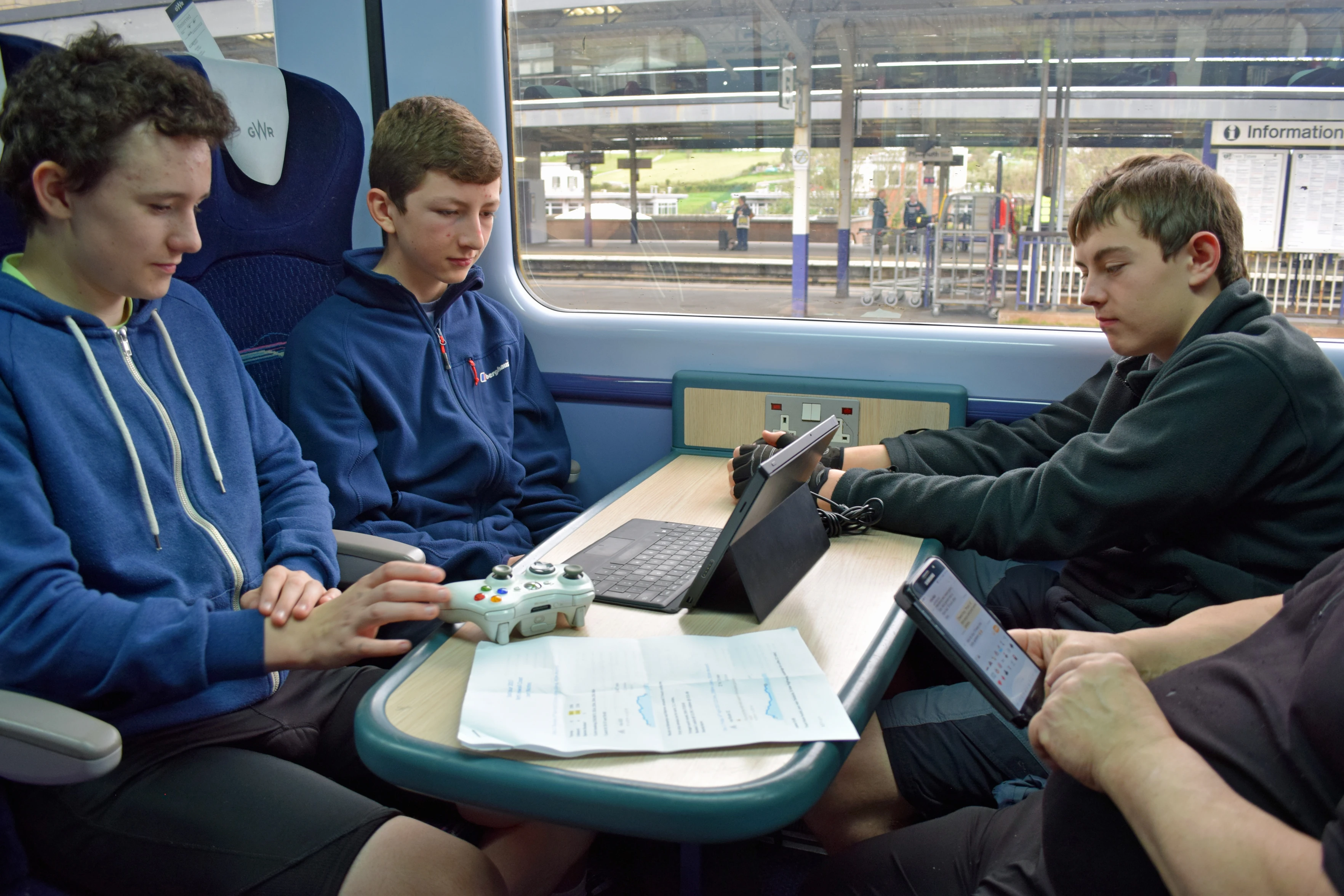 Jude, George and Dillan on the 10.07 from Totnes to Liskeard, at Plymouth station.
